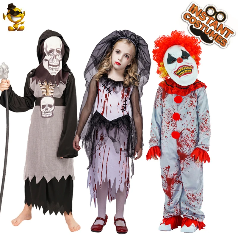 Костюм Скелета QLQ для мальчиков, косплей, Детский комбинезон клоуна, кровяного цвета, маскарадное платье, кровавый костюм невесты для девочек, вечерние ринка на Хэллоуин