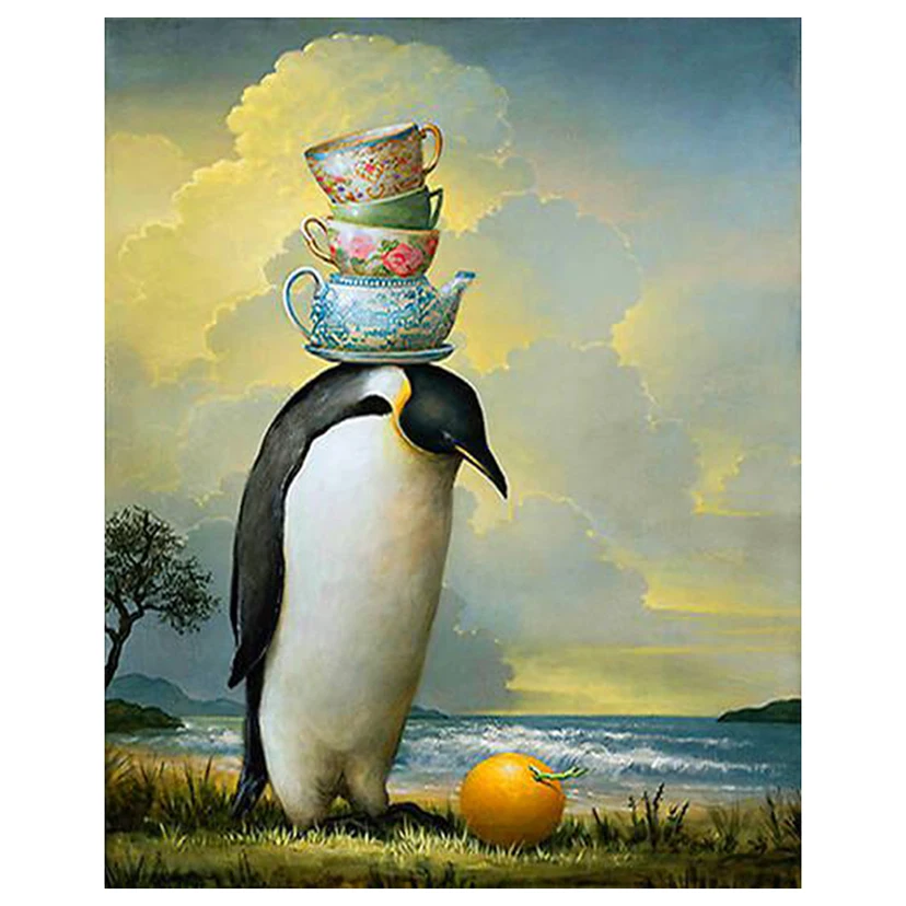 5D сделай сам, полностью круглая алмазная живопись, Пингвин и чайный сервиз и оранжевая вышивка крестиком, 3D вышивка стразы, мозаика, домашний декор, искусство Y1646