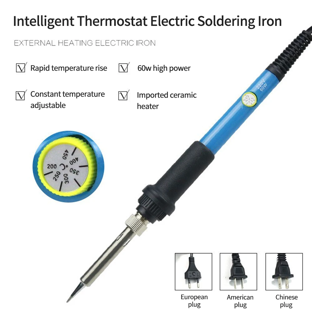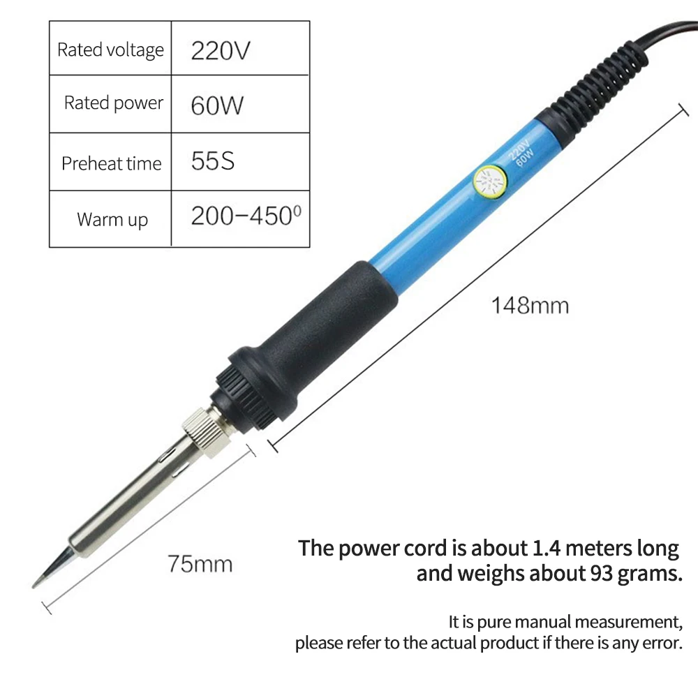 Особенности:1. Этот интеллигентая (ый) термостат Электрический паяльник набор кистей отличается блестящими 60 Вт высокой мощности и 6-ступенчатая регулировка температуры, который может быстро нагревается и контролировать температуру свободно, что позволяет безопасно и стабильно выполнять сварки.2. Импортированный керамический нагревательный сердечник с канавкой и выступающей головкой делает наш костюм более противоударным, с более высокой эффективностью нагрева и более длительным сроком службы.3. Эргономичная ручка с резиновой матовой оболочкой мягкая, удобная, теплоизолированная, противоскользящая и противоскользящая, подходит для длительного использования.4. Экологически чистый наконечник паяльника и Двухслойное никелевое покрытие прочные и долговечные, которые имеют функцию быстрого нагрева и коррозионной стойкости, а также предотвращения ржавчины и омолаживания.5. Анти-складной шнур питания оболочка изготовлена из мягкой резины с хорошей прочностью, которая может эффективно защитить шнур питания от повреждения.6. Наши наборы паяльников могут широко использоваться для ремонта и сварки различных электронных продуктов, таких как мобильные телефоны, компьютеры, телевизоры и т. д.7. Этот стартовый набор паяльника прост и безопасен в эксплуатации и очень подходит для новичков.Характеристики:Материал: пластик, силикон, нержавеющая стальЦвет: черный, синийРазмер: 16*2*2 ммВес: 0,51 кгРазмер упаковки: 263*151*44 ммСтиль А Упаковочный лист:1 * паяльник5 * дополнительные советы2 * пинцет1 * припой1 * жестяная проволочная трубка1 * подставка для паяльника1 * Чистящая губка1 * сумка для переноски1 * отвертка для припоя1 * вилка для припоя1 * припой assist squeeze head1 * припой вспомогательный крюк1 * щетка для припоя1 * игла для припоя