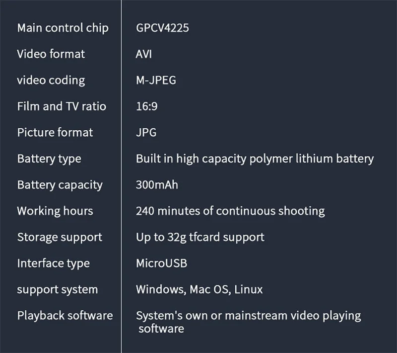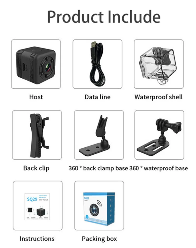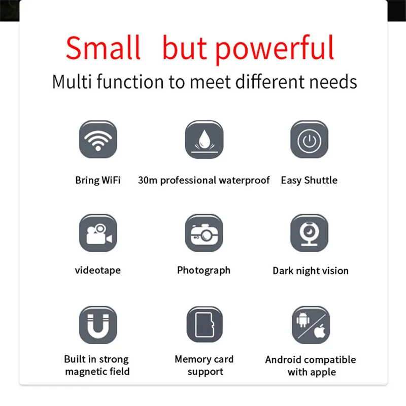 ● 30 м водонепроницаемый дизайн для высокой производительности ● Поддержка циклической записи на tf-карте: Нет необходимости удалять предыдущее видео. ● Инфракрасное ночное видение: 6 инфракрасных ламп, мощный эффект ночного видения. -Мини-размер: небольшой форм-фактор, портативный Портативный DV DC, подходит для различных случаев. ● Подключение Wi-Fi: Поддержка Wi-Fi подключения, передача видео в режиме реального времени, можно использовать мобильный Трафик данных для управления камерой, вы также можете использовать управление Wi-Fi. ● Долгое время работы: встроенный литий-ионный аккумулятор емкостью 300 мАч, время работы до 240 минут. ● Автономный Wifi для автоматического подключения к телефону