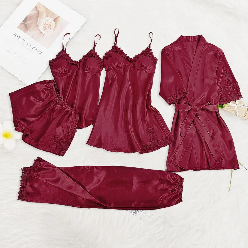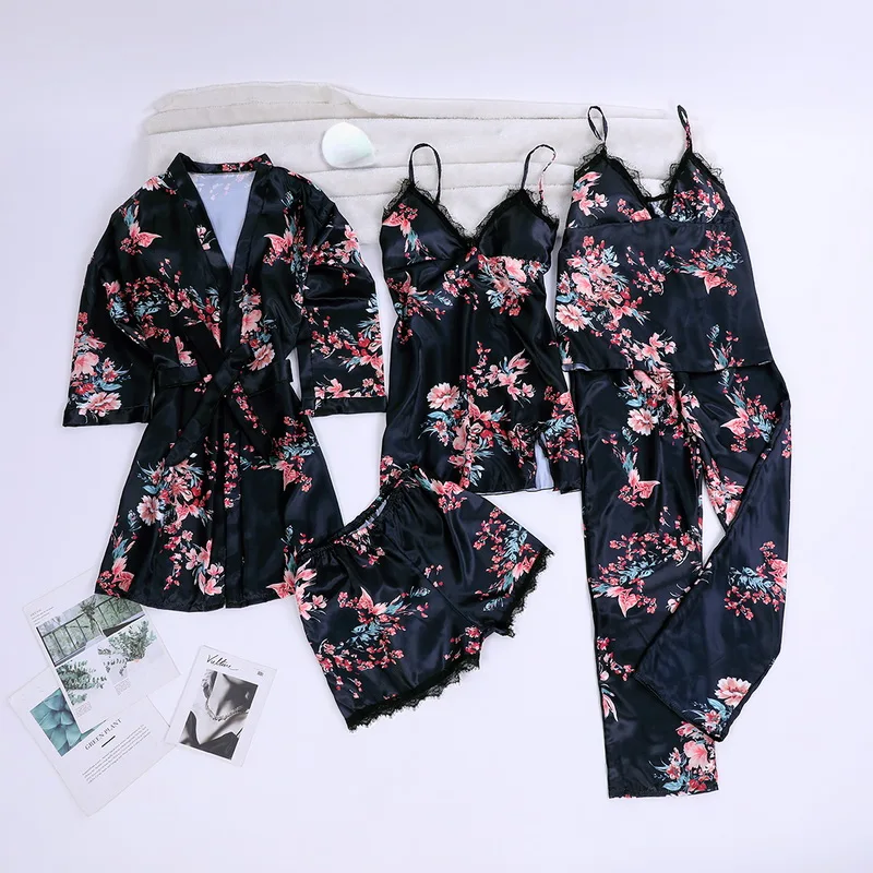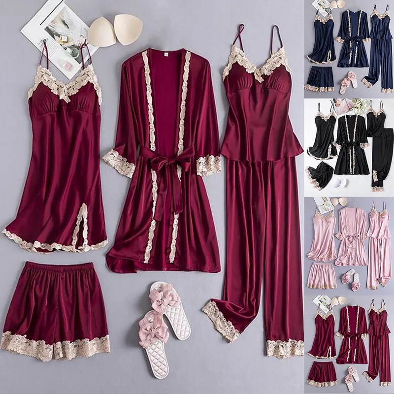 Пижамный комплект из 5 предметов, повседневная одежда для сна для женщин, атласная кружевная одежда для сна в стиле пэчворк, весна-осень, домашний новый Пижамный костюм