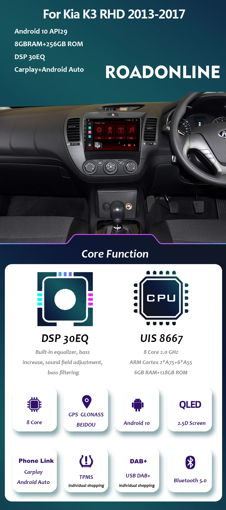 Автомобильный навигатор 8 + 256 ГБ для Kia K3 RHD 2013-2017 GPS Автомобильный мультимедийный плеер Радио Android 10 Octa Core