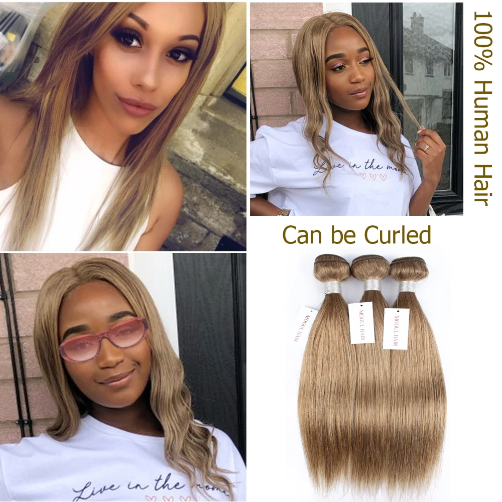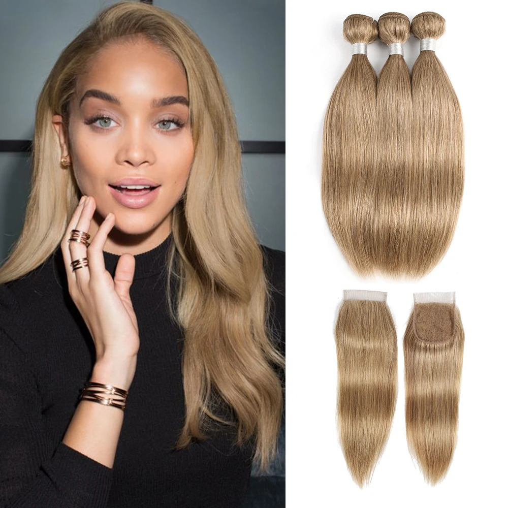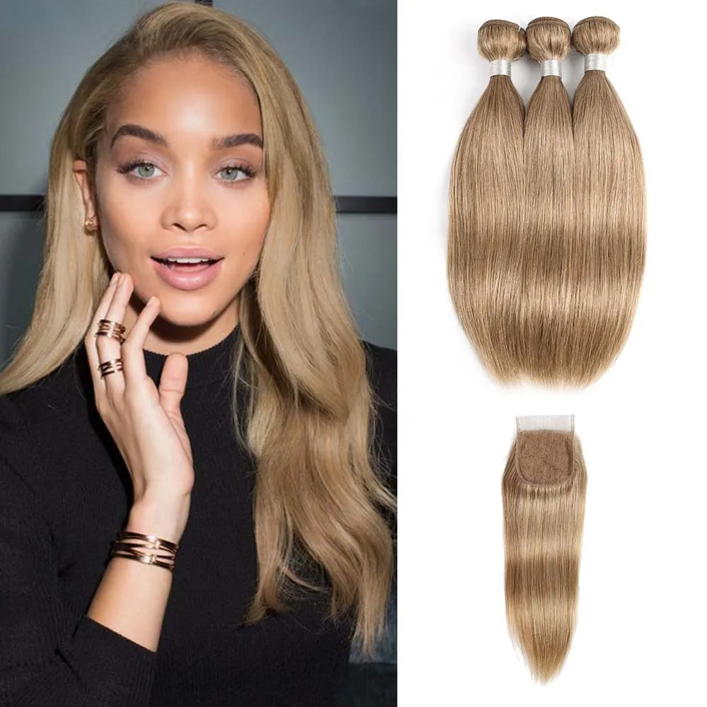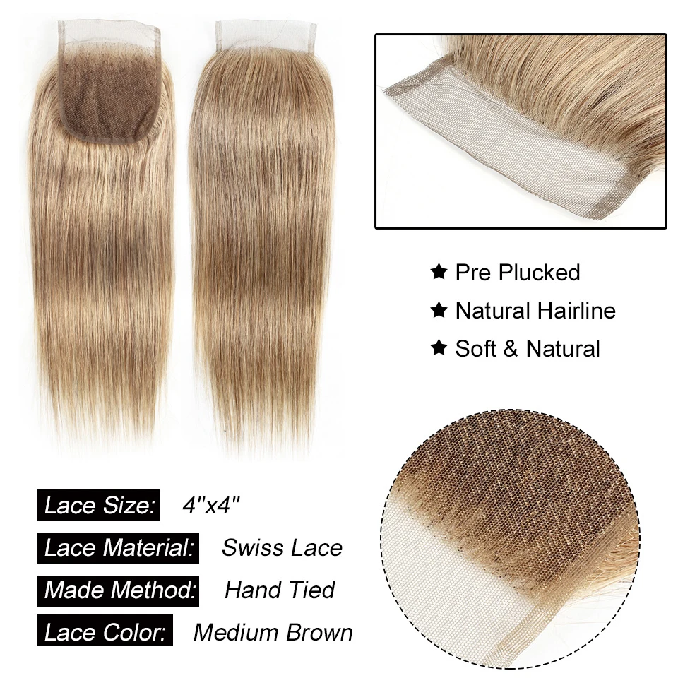 Цвет 8 пепельный блонд 34 пряди с 4x4 кружевной застежкой свободная часть прямые человеческие волосы Remy наращивание 16-24 дюйма могульский волос