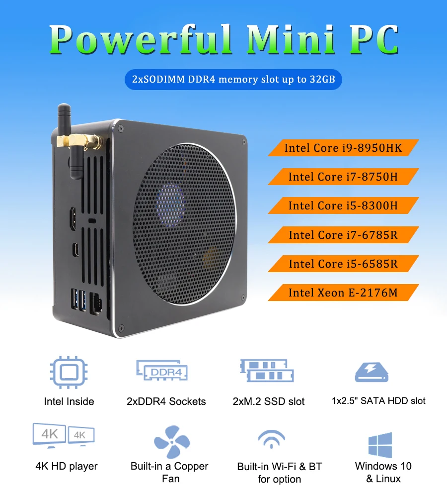 Мини-компьютер Intel Core i5 9300H, 8300H, i7 8750H, i9 8850H, Xeon1505MV5, Windows 10 Pro, Linux, DP HD1.4, 4K HD