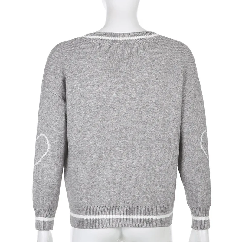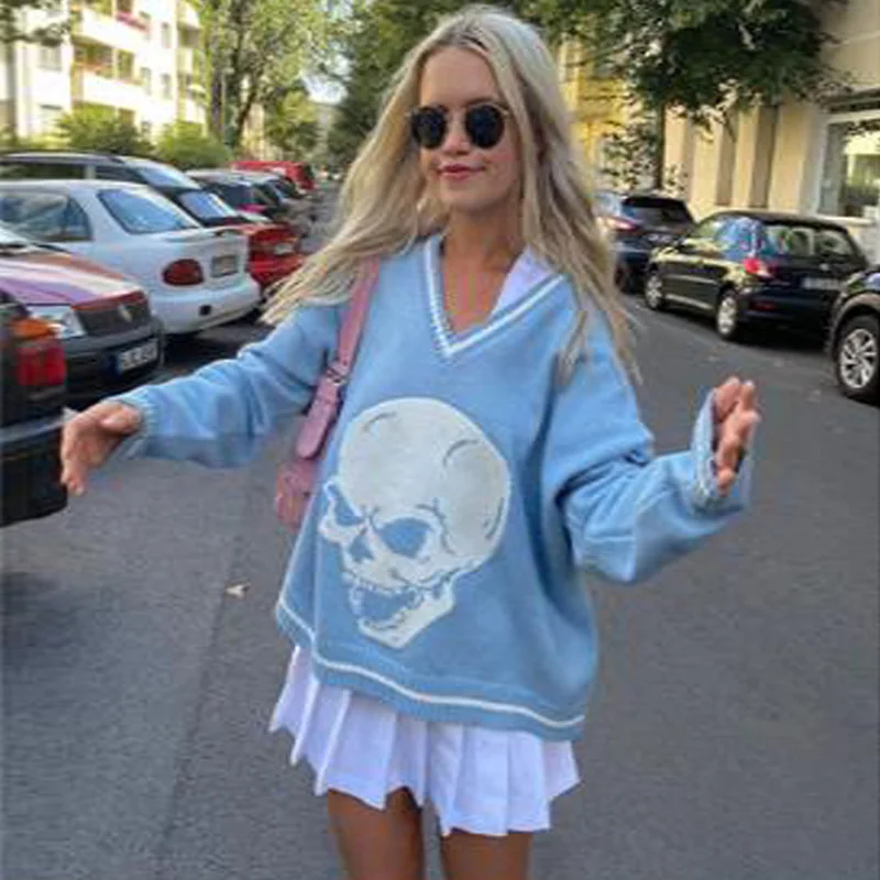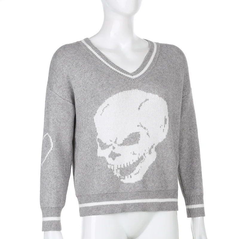 Повседневный свитер с принтом черепа в стиле Харадзюку, свободные осенне-зимние топы с V-образным вырезом и длинным рукавом, женские модные однотонные пуловеры в стиле пэчворк, новинка 2021