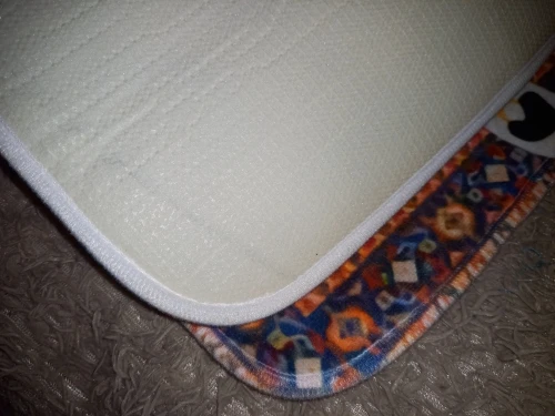 На ощупь приятный плюшь лицевая сторона, изнанка типа качественного коврика в санузел с прорезинкой, между — слой, типа тонкого пороллона; Ожидания оправдал, впринципе неплохо. По качеству, учитывая шуточное исполнение — вполне очень даже, своих денег стоит, смешной! Края закруглённые, не такие как на фото. Печать смещена: чёрный край (полоска) — неравномерна неравномерна.