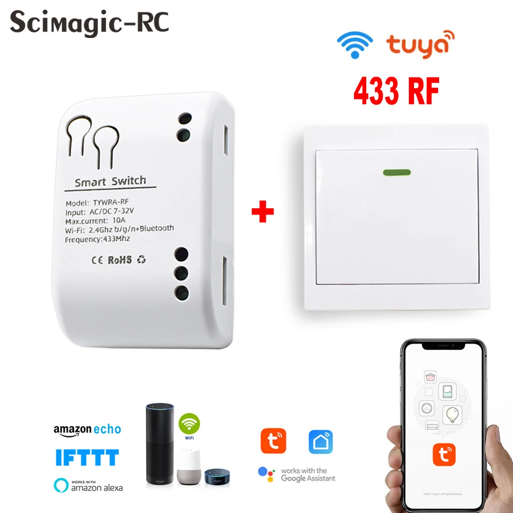 1 канал, Wi-Fi переключатель, 12 В, 24 В, 433 МГц, радиоресивер, 1 клавиша, умный пульт дистанционного управления Tuya и настенный передатчик 433 МГц