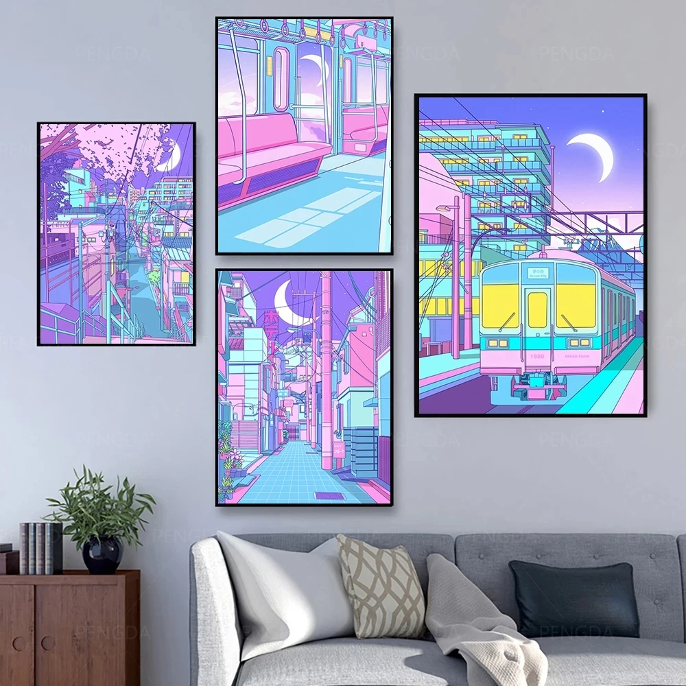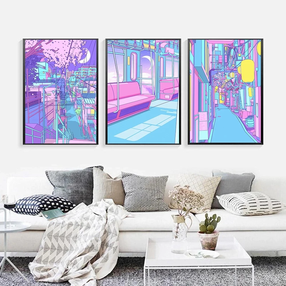 Модульное настенное искусство мультфильм вид улица фиолетовые милые картины на холсте картины печать плакат домашний декор для гостиной без рамки