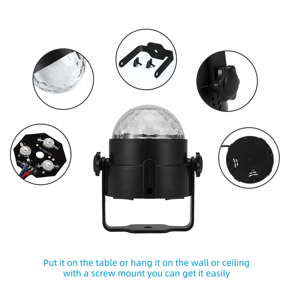 Дискотеки для вечеринок подходят для КТВ, вечеринок, дискотек, сцен, дней рождения, танцев, детских комнат, праздников, свадеб, караоке, банкетных залов, баров, клубов и т. д.Характеристика:1. Семь цветов вращают диско-светильник: (красный, зеленый, синий, красный/зеленый, красный/синий, зеленый/синий или все цвета вместе). Легко выбрать сплошной или многоцветный с пультом управления чувствительностью. Полностью регулируемая скорость движения.2. Внешний вид маленький и изысканный. Легко носить с собой3. Низкое энергопотребление, стабильная производительность освещения и длительный срок службы, До 50000 часов4. Легко установить, просто подключите его и играйте.5. Пульт дистанционного управления: светильник с контролем цвета, голосом, автоматическим распознаванием,6. Специально разработанный в кристальной сфере, стильныйХарактеристики продукта:Эффект: светодиодный магический шарМатериал: АБС-пластикСветодиодный светильник цвет источника: RGB 3*1WМощность питающее напряжение: AC 100-240V 50 / 60HzМощность питания постоянного тока: 5V / 1AУгол луча: 120 градусовДиапазон управления: <10 метровРежим управления: пульт дистанционного управления/автоматический/голосовой (Автоматическая идентификация)Режим работы: Активированный звук, автоматическое воспроизведениеВес нетто: 0,26 кгПосылка:1 * RGB Хрустальный сценический светильник с вилкой1 * пульт дистанционного управления (без аккумулятора)1 * Руководство пользователя