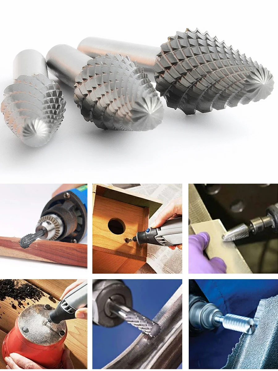 [Двойная режущая головка] двойная режущая головка имеет ряд зубцов для резки в двух пересекающихся направлениях для быстрого удаления материала и более гладкой отделки. Самый популярный выбор для быстрого удаления на складе углерода и нержавеющей стали.Двойная резка в основном подходит для обработки материалов низкой плотности, таких как мрамор, нефрит, кость и другие неметаллические материалы. При обработке твердых металлов (железо, сталь...), пожалуйста, уменьшите скорость электрического или пневматического приводного инструмента