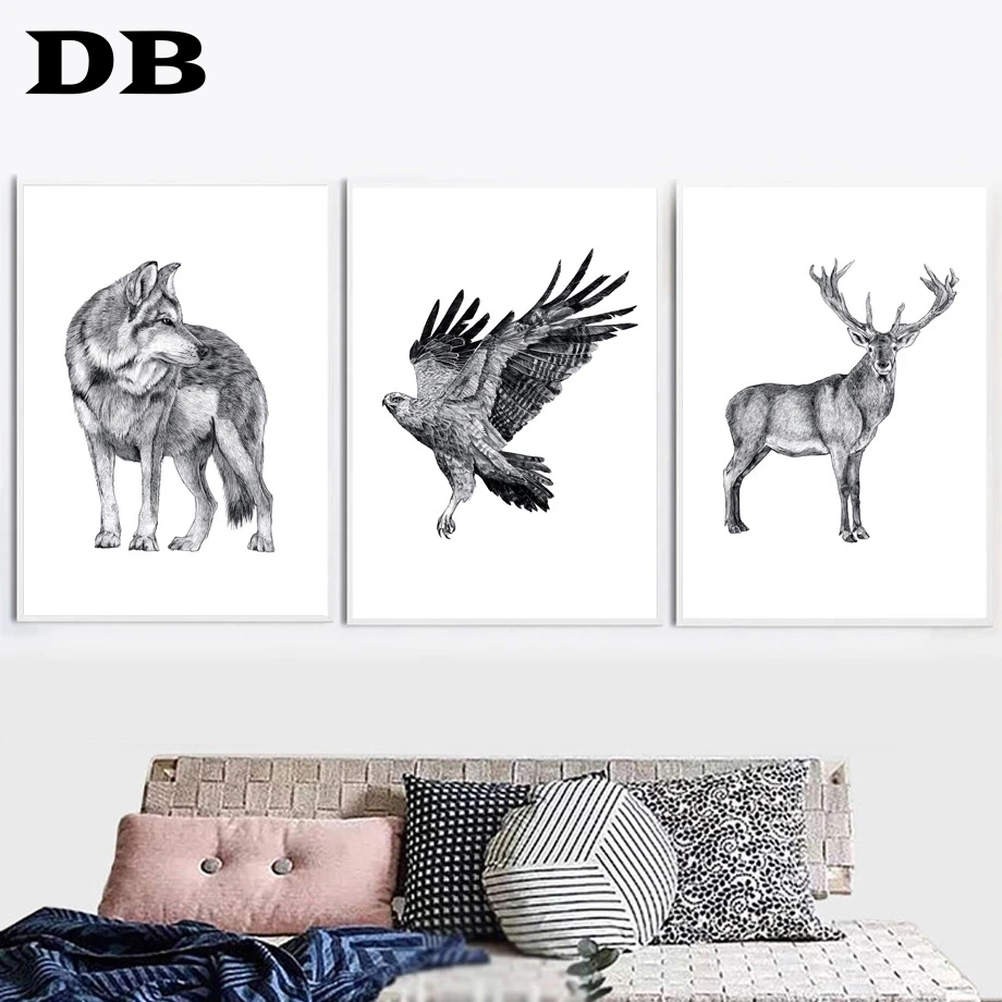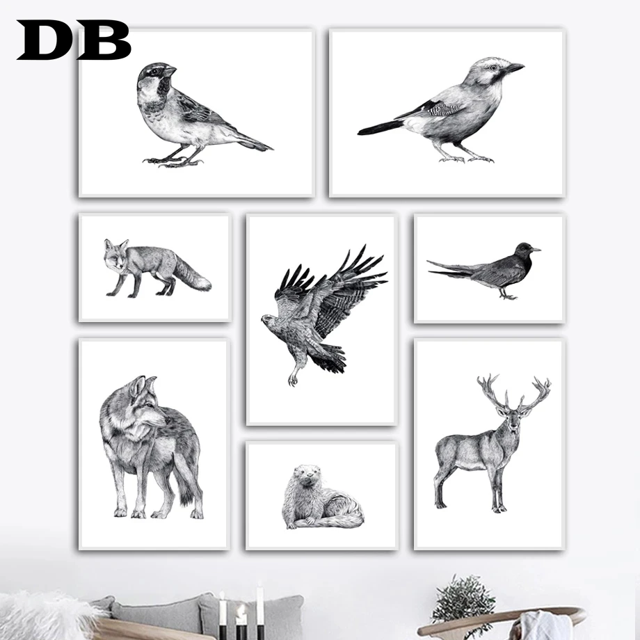 Настенная картина черного и белого цвета, Орлан, ворона, птица, лиса, олень, волк, Картина на холсте, постеры и принты в скандинавском стиле, настенные картины для декора гостиной