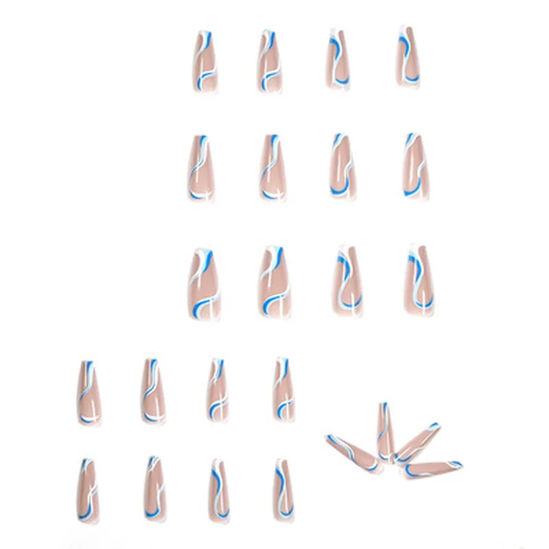 24 шт. синие и белые волнистые линии съемные Длинные накладные ногти балерины с дизайном носимые гвозди накладные ногти полное покрытие накладные ногти
