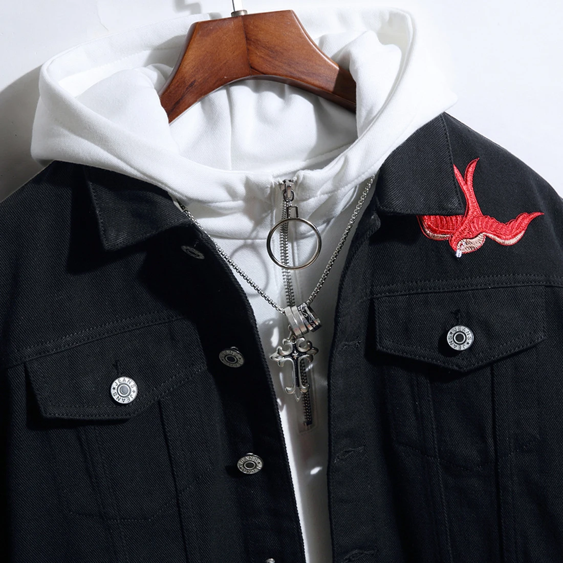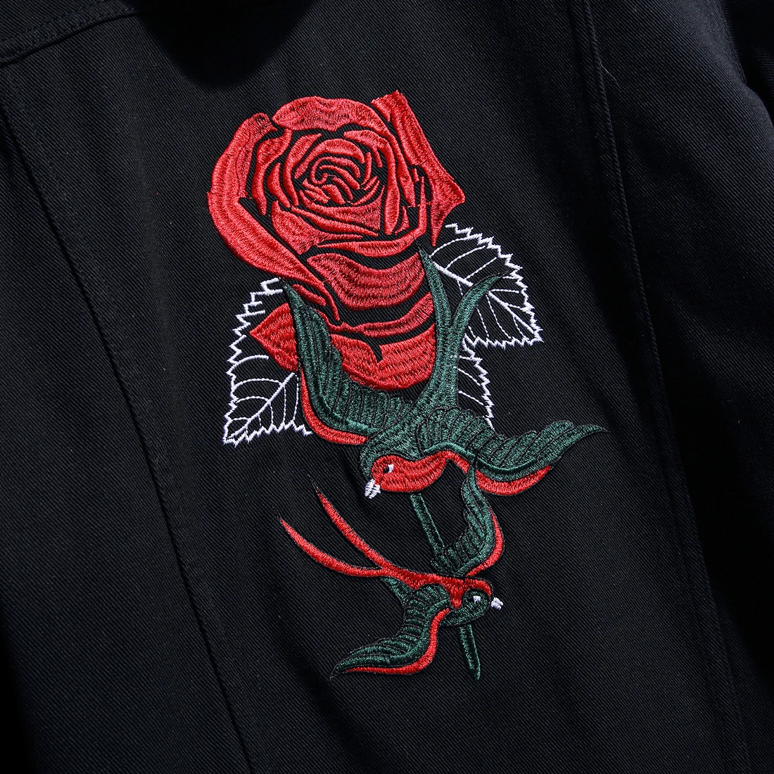 Riinr вышитая джинсовая куртка 2021 Черная Мужская джинсовая куртка с капюшоном с индивидуальным рисунком модная Изысканная розовая куртка с цветочным принтом