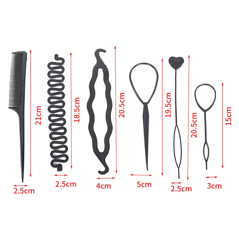 Описание:100% новый и высокое качествоСпецификация:Материал: пластикРазмер: как показано на картинкеЦвет: черныйПосылка включает в себя: 1 комплект (6 шт.) x Инструменты для укладки волосПримечания:1. Пожалуйста, учитывайте разницу в 1-3 мм из-за ручного измерения, спасибо за понимание!2. Из-за разницы между различными мониторами изображение может не отражать фактический цвет товара.