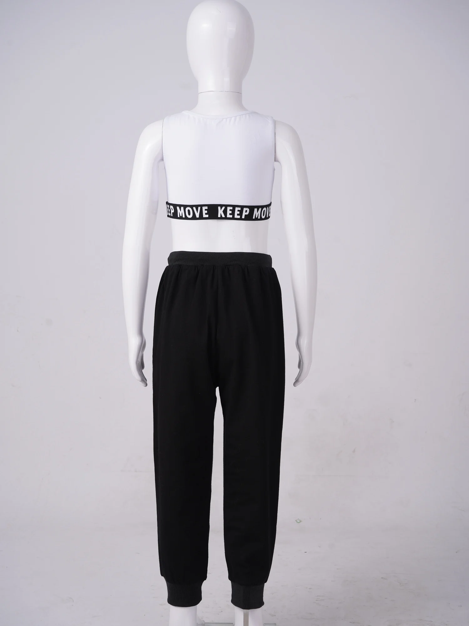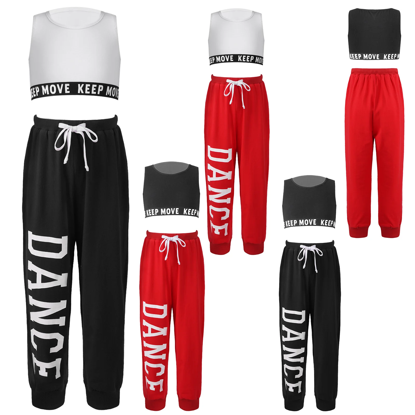 Стильные танцевальные наряды для девочек от 6 до 14 лет укороченный топ с круглым вырезом, без рукавов, с буквенным принтом, с эластичным подолом, на завязках, с эластичным поясом, с принтом больших букв, штаны с завязками на лодыжке Одежда для танцев