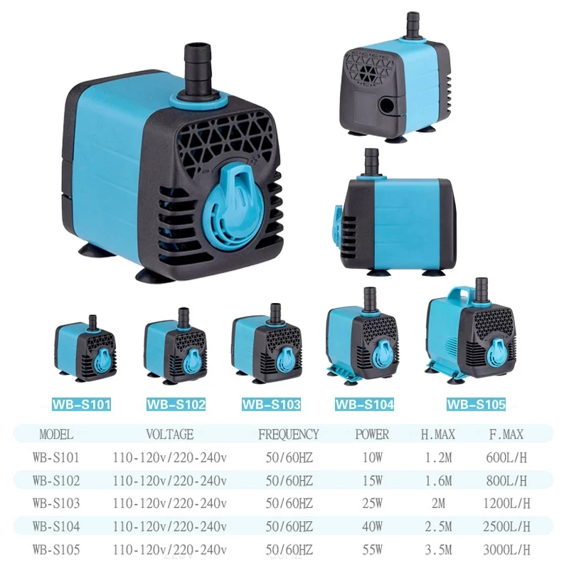 Характеристика:-100% новый и высокое качество-Погружной водяной насос-Погружной двигатель, низкий уровень шума, низкое энергопотребление-Простота установки и обслуживания-Прочный вал, магнитный ротор навсегда-Подходит для пресной и морской воды-В комплекте с примерно 1,8 м кабель-Материал: АБС-пластик-Диаметр соединения трубы:10 Вт: 8-13 мм15 Вт/25 Вт: 13-16 мм40 Вт/50 Вт: 13-16-19 мм Примечание:1. Допускается погрешность в 1-2 мм из-за ручного измерения.2. Из-за разницы между различными мониторами изображения могут не отражать фактический цвет изделия. Посылка включает в себя:1 х погружной водяной насос1 х адаптер питания Тип: (опционально)Модель Напряжение частота мощность H.MAX F. Максимальный размерWB-S101 220V-240V 50HZ 10 Вт 1,2 м 600L/H 73*44*53 ммWB-S102 220V-240V 50HZ 15W 1,6 M 800L/H 84*53*66MMWB-S103 220V-240V 50HZ 25 Вт 2 м 1200L/ч 99*59*70 ммWB-S104 220V-240V 50 Гц 40 Вт 2,5 м 2500L/H 125*95*99 ммWB-S105 220V-240V 50HZ 55 Вт 3,5 м 3000L/H 149*80*105 мм. Уважаемый, пожалуйста, обратите внимание на напряжение и вилку вашей страны перед покупкой. Если напряжение неправильное, часть питания насоса будет повреждена напряжением. В этот чехол, мы не делайте каких-либо послепродажного обслуживания.