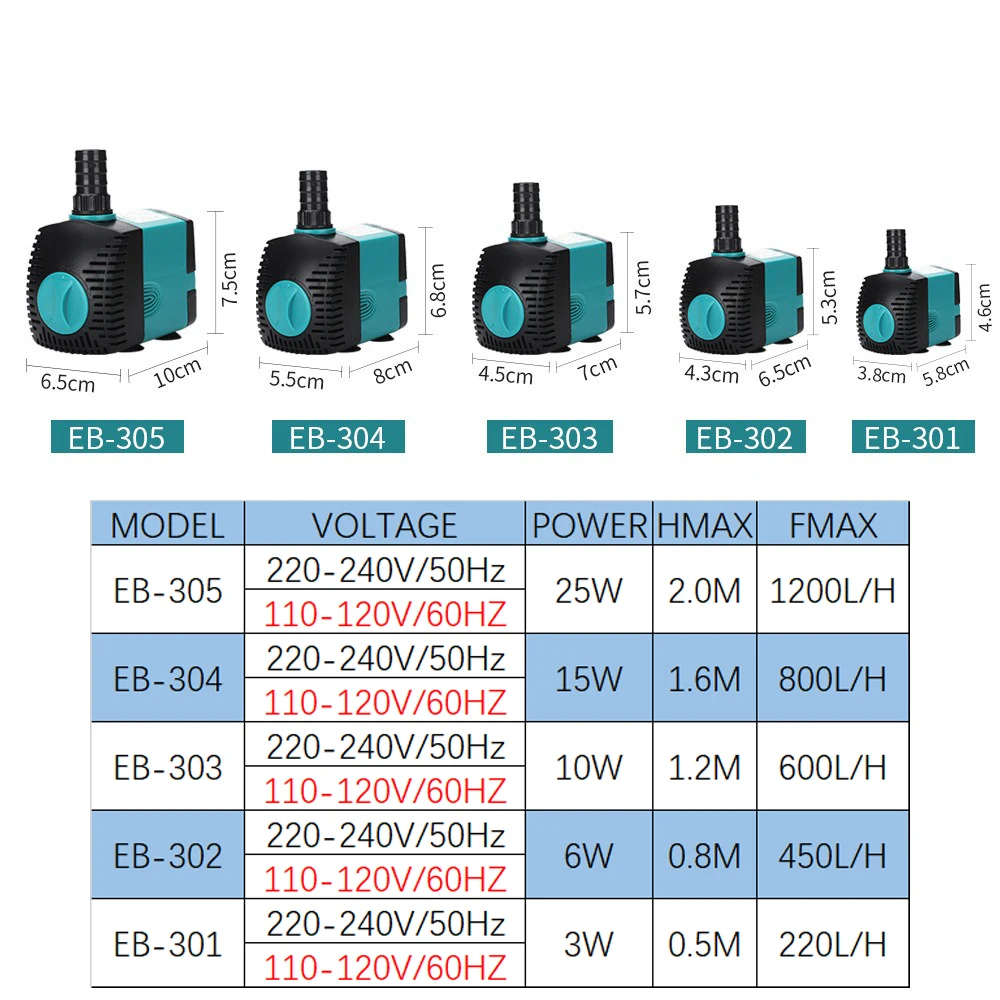 Особенности:-Бибулоус на 360 °-Низкий уровень шума и шумоподавление.-Насос может быть запущен на уровне воды 5 см и перекачивается до 1 см.-Дно насоса для всасывания в окружающую воду, эффективно очищающей рыбные экскременты и примеси в резервуаре.-Удобная ручка и толстый пластиковый чехол из АБС-пластика.-Погружной насос широко используется в аквариумах, фонтанах, spouts, гидропонных системах и т. д.-Съемный и чистый.Область применения: аквариум для рыб, садовый фонтан, водные изделия, водяное охлаждение, вентиляционное оборудование для кондиционирования воздуха, охлаждение и другие области.Напряжение: 220-240 В (настраиваемый)Длина провода: 1,5 м (40 Вт, 60 Вт, 90 Вт Длина провода: 1,8 м, могут быть выполнены по индивидуальному заказу в соответствии с требованиями)Посылка по весу бруттоEB-0,20 кг A300 9*7*8,5 смEB-0,22 КГ A600 9*7*8,5 смEB-0,31 кг A800 9*9,5*11 смEB - A1000 0,44 кг (12,5*10*12,5 смEB-0,80 кг A1500 15*12*14,5 смEB-1,07 кг A2500 15*12*17 смEB-2,00 кг A4000 14*18,5*18,5 см