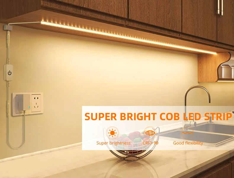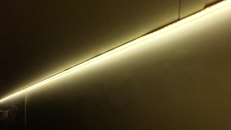 Лента очень понравилась. Очень яркая и светит сплошной полосой. Всем советую брать именно такую, если вы хотите осветить рабочую зону в кухне над столешницей. Заказывал с сенсорной диммируемой кнопкой. Легко включается, отключается и регулируется яркость. Такую кнопку можно заменить на любой другой датчик.