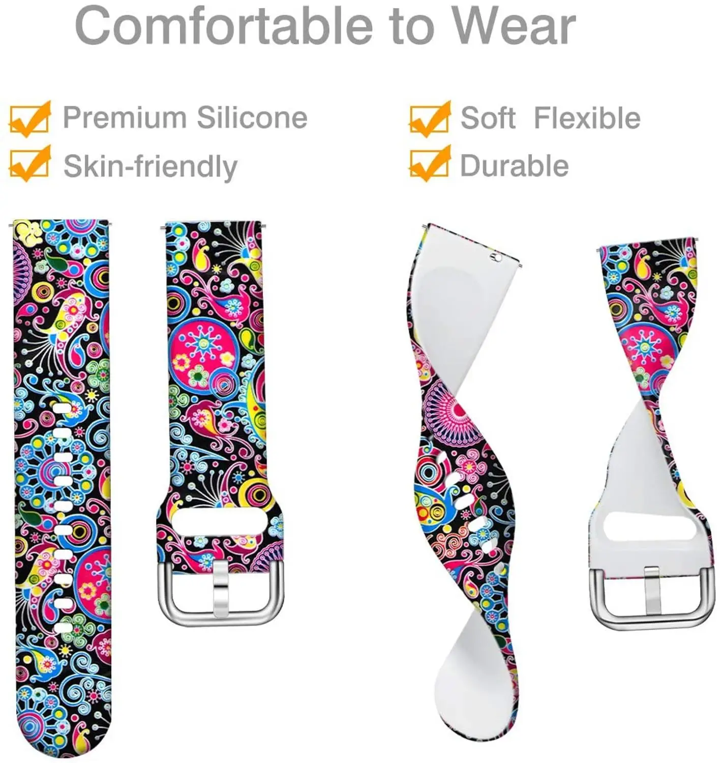 1. Совместимые модели: совместимые с Samsung Galaxy Watch Active/Active2 40 мм/44 мм, Galaxy Watch 42 мм, Gear Sport,Gear S2 Classic, Gizmo Watch, huawei Watch 2/Huawei watch 2 Pro, MOTO 360 2nd Gen 42 мм, garmin vivoactive 3/Garmin vivomove HR/Garmin Forerunner 645/245,Ticwatch 2/Ticwatch E/Withings Steel HR 40 мм, также подходит для любых традиционных или умных часов, которые используют Пружинные стержни 20 мм2. Таблица размеров: подходит для 5,51 "-8,46" (140 мм-215 мм) запястья, идеально подходит для почти любого запястья в спорте, бизнесе, повседневной жизни, вечерние и т. Д.3. Дизайн с принтом: передовая печать обеспечивает яркий и безворсовый рисунок, делает узор устойчивым к коррозии и долговечным, водонепроницаемым и впитывающим пот. Различные узоры позволяют вашим часам элегантно, стильно и уникально4. Высокое качество: Изготовлен из высококачественного силикона, светильник прочный, предотвращает раздражение кожи, без запаха, предлагает вам гибкий и удобный ношение. Специальная конструкция пряжки может надежно зафиксировать ваши часы и гарантирует, что конец ремешка надежно останется на месте.5. Быстрая установка: быстроразъемные Пружинные полосы на обоих концах ремня, которые позволяют менять полосы за считанные секунды, вы можете легко менять различные узоры, чтобы соответствовать вашим нарядам и для разных случаев, для отдыха и офиса, для фитнеса и вечерние
