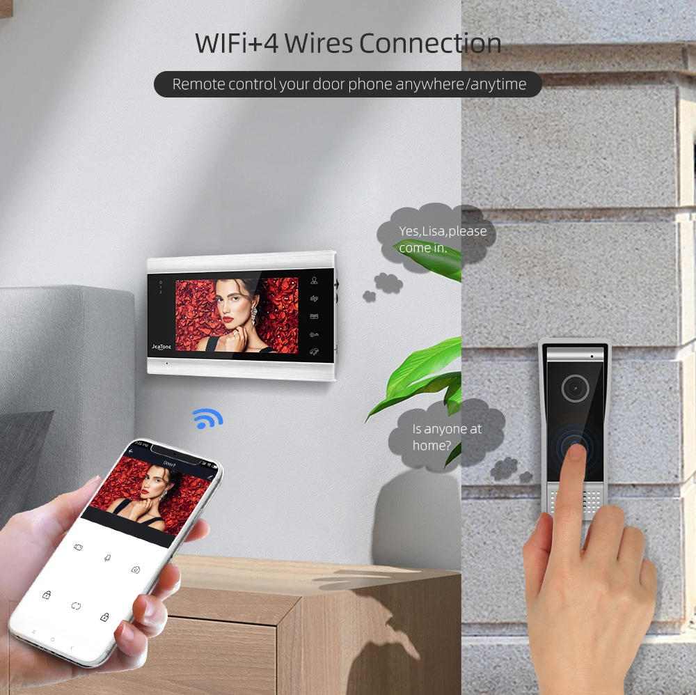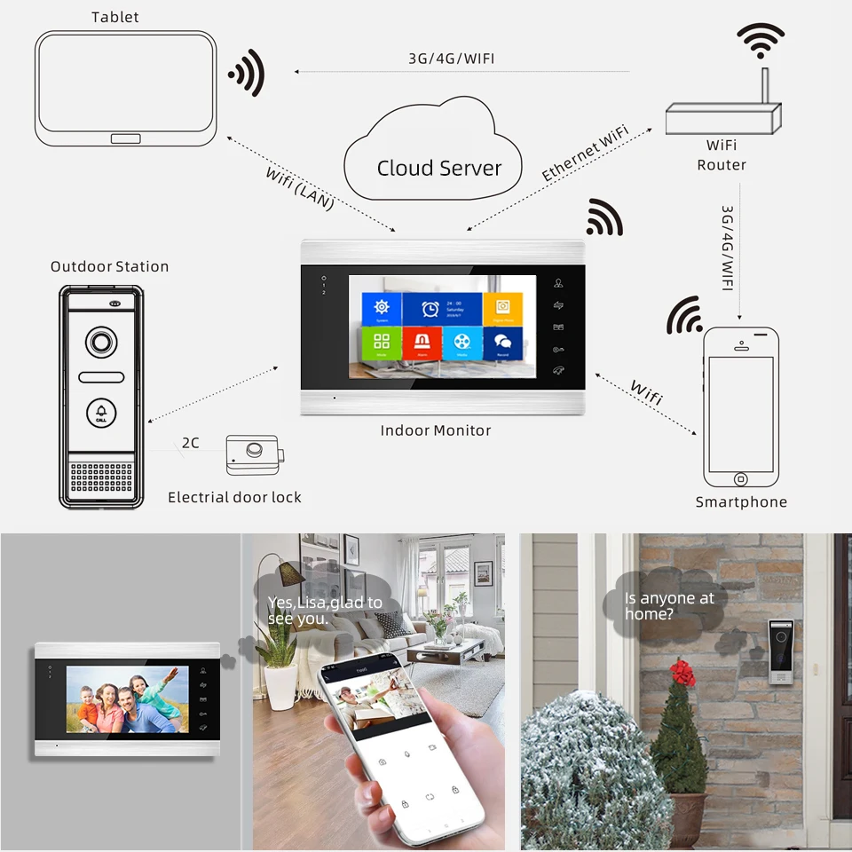 Обратите внимание, что система видеодомофона Wi-Fi не означает, что вам не нужно подключать какие-либо кабели. Дисплей поддерживает беспроводное подключение Wi-Fi, но внутренний дисплей и дверной звонок подключены для обеспечения стабильной работы питания и видео, и может увеличить расстояние
