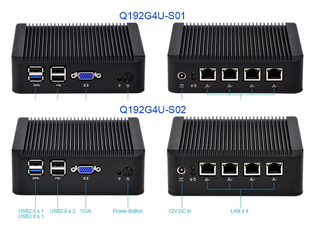 (Мини ПК Q192G4U-S01 / S02 имеют тот же Алюминиевый металлический корпус и порты, за исключением высоты и SATA HDD/SSD.)