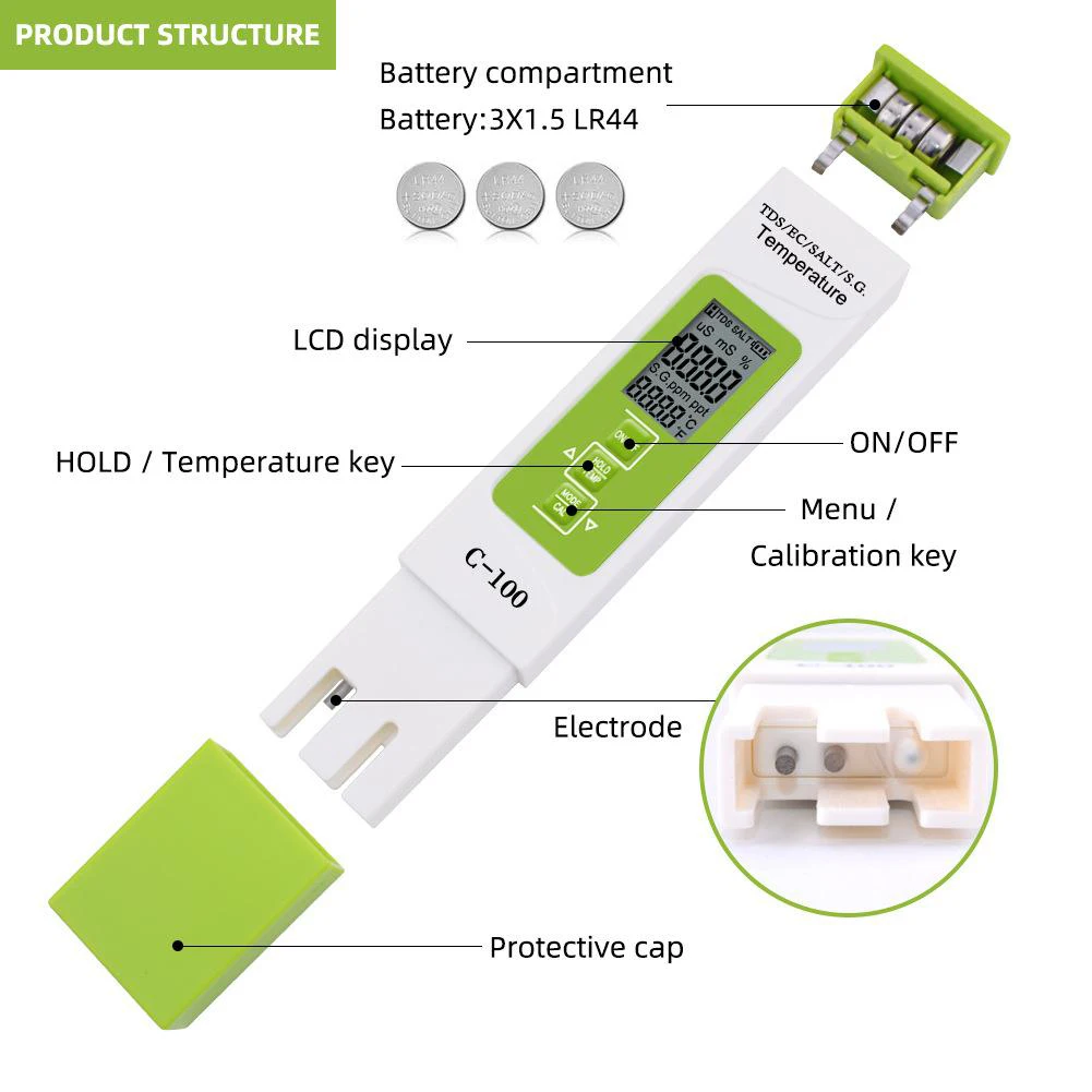 Тестер качества воды 5 в 1, C-100, Многофункциональный тестер солен...