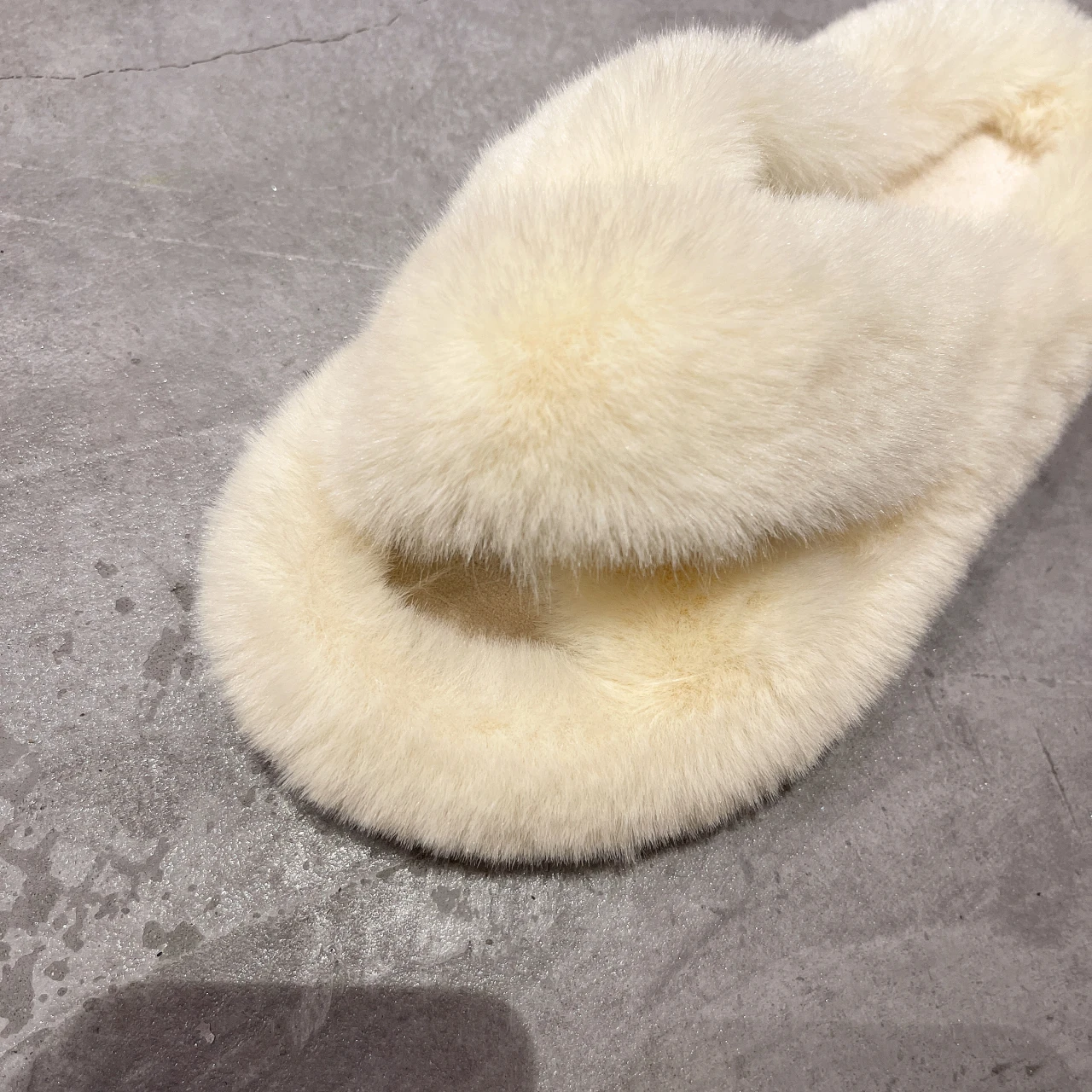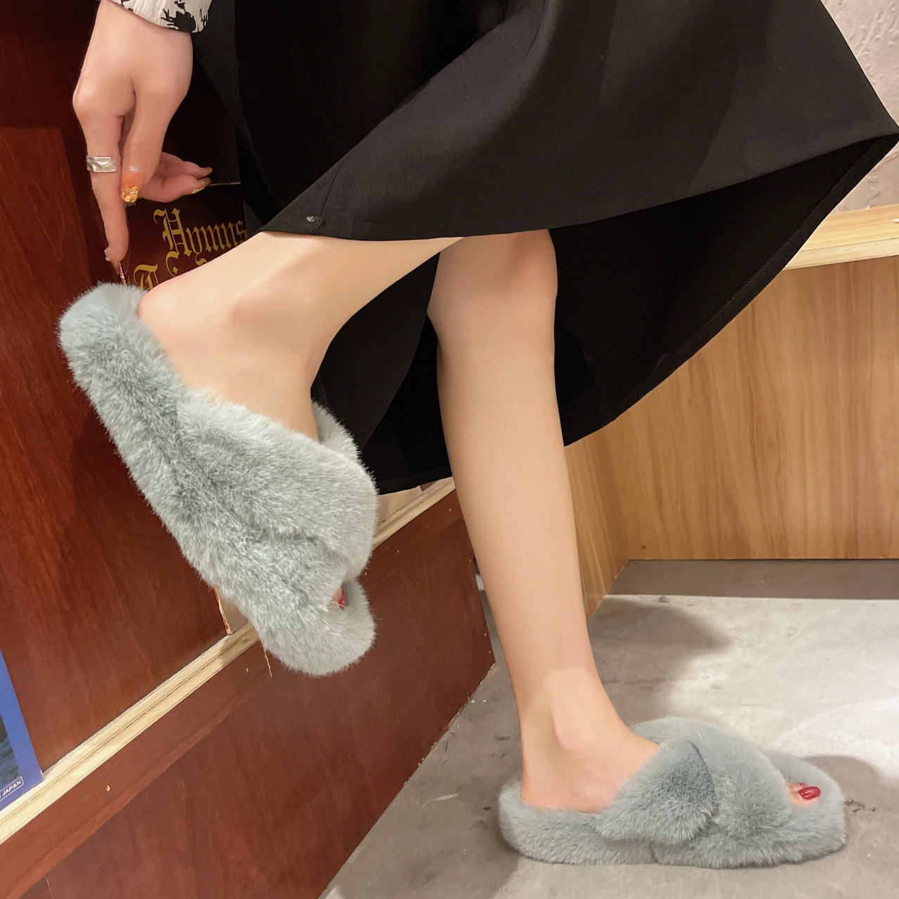 Тапочки меховые женские, зимние, однотонные, с перекрестными ремешками