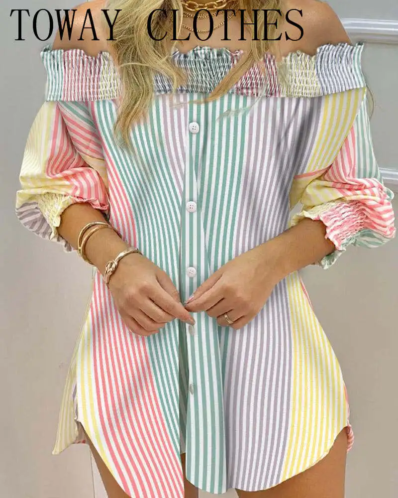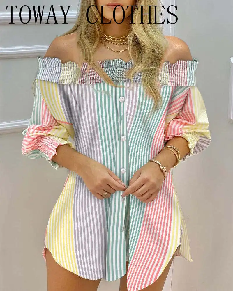 Женское платье-рубашка в полоску, с открытыми плечами и пуговицами спереди