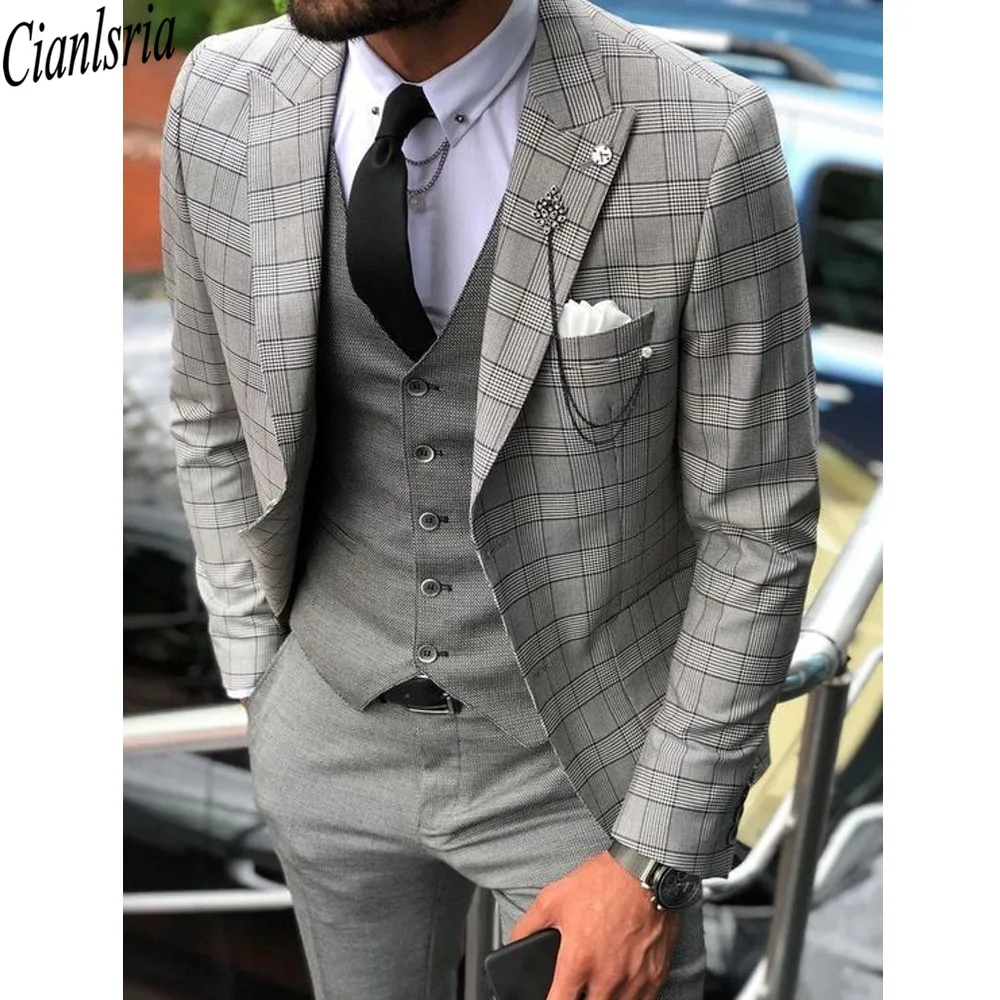 Мужские деловые формальные облегающие костюмы для свадьбы и выпускного вечера, мужское эксклюзивное клетчатое платье для жениха, блейзеры, комплект из 3 предметов, 2021