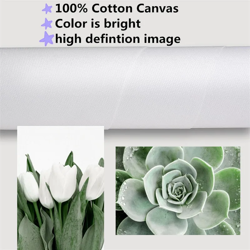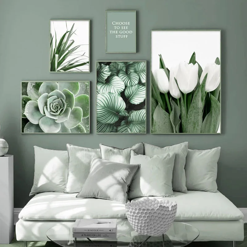 Картина на холсте, с изображением белых тюльпанов, зеленых растений, орхидеи, алоэ, монстеры