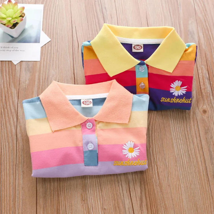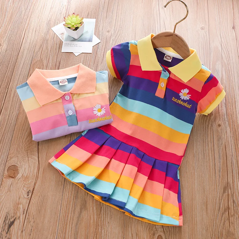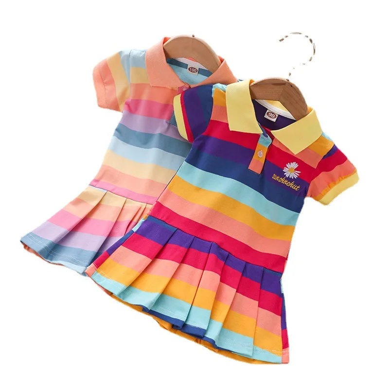 Радужное плиссированное платье для девочек, весенне-летняя детская одежда с отложным воротником, модная одежда поло для маленьких девочек