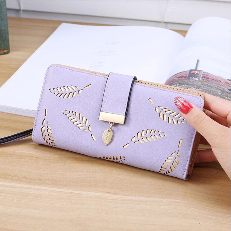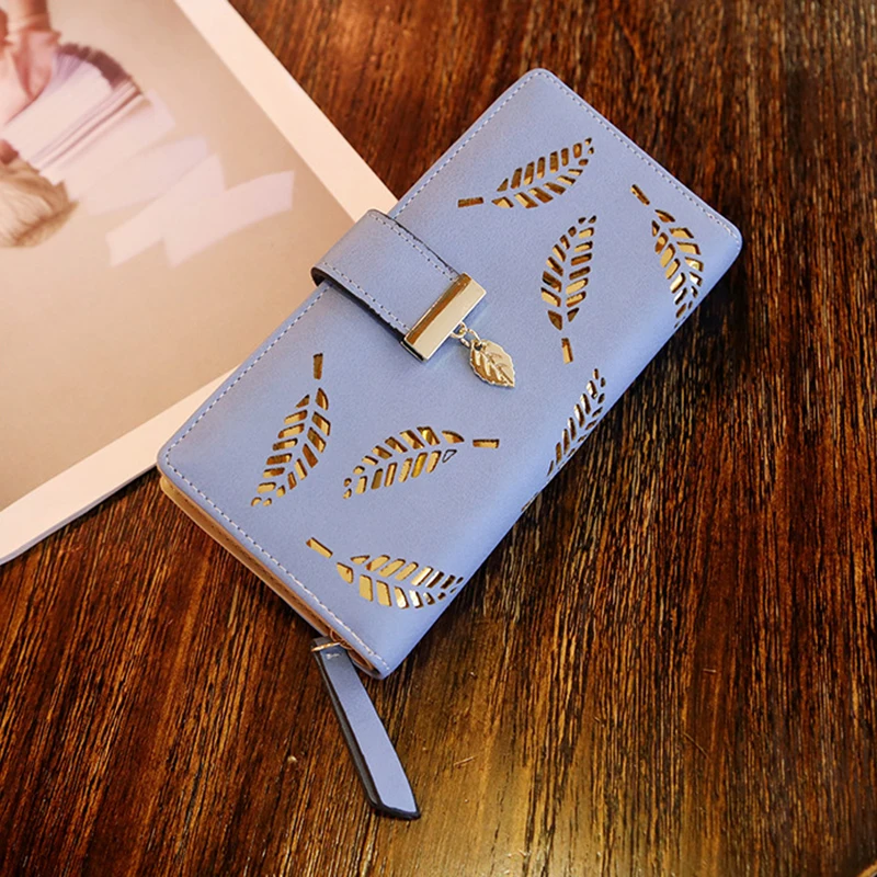 Женский кожаный клатч-кошелек, длинный держатель для карт, сумка для телефона, чехол, Длинный кошелек на молнии с пряжкой с полыми листьями, дамские сумочки