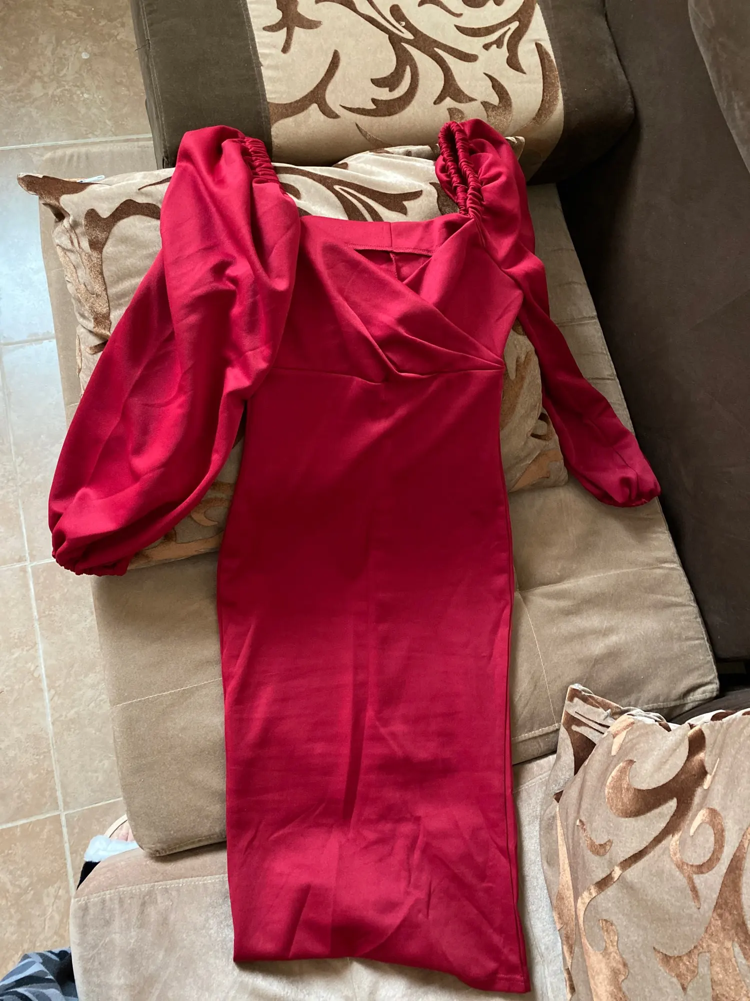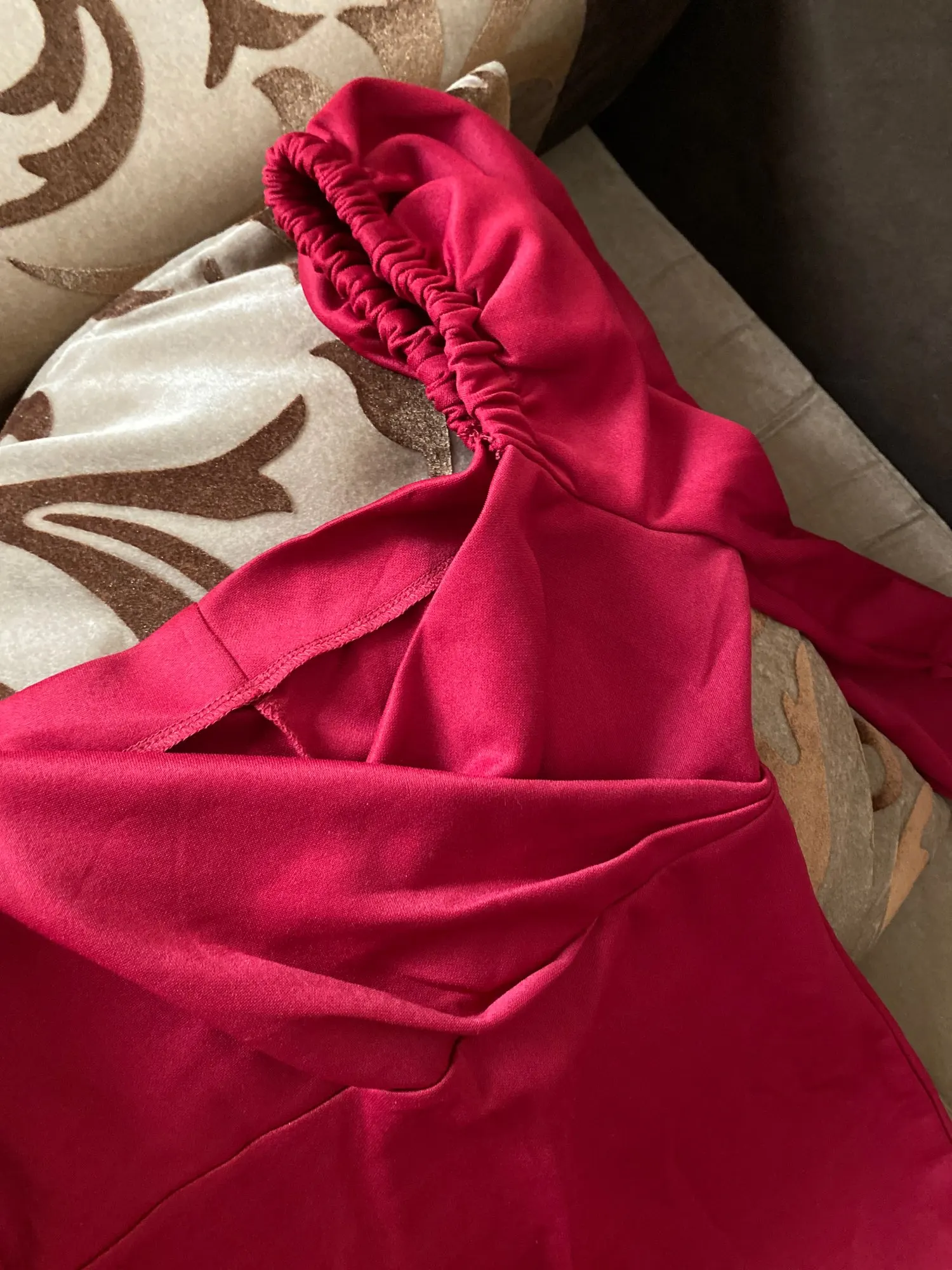 Цвет на тон светлее чем на картинке, но всё же приглушённый красный. Судя по картинкам из отзывов думала что будет ярки цвет, и как же я обрадовалась когда пришло платье цвета розы. Очень приятная мягкая ткань, думаю оно может чуток тянуться под облегая все линии фигуры. Старалась хорошо сфотографироваться, если помог отзыв не забудь его отметить