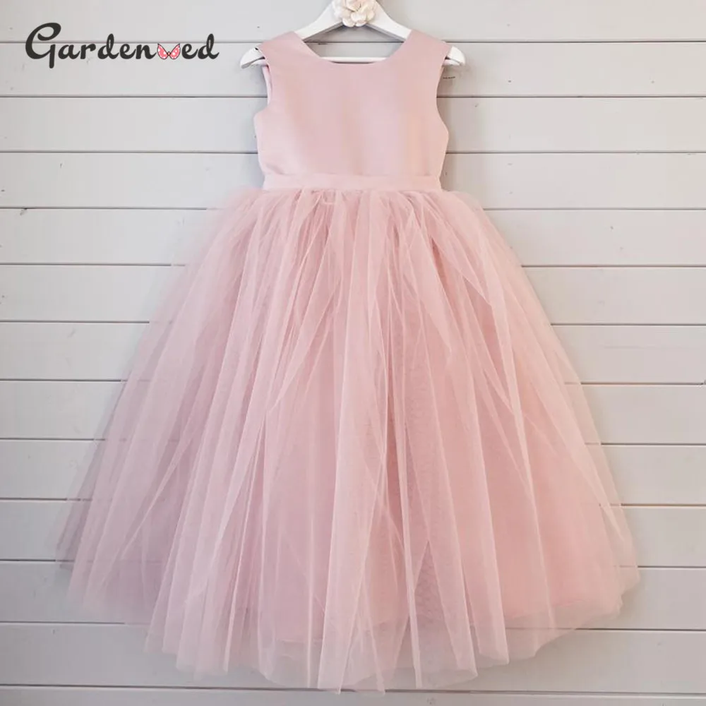 Розовое Пышное Цветочное платье для девочек, пышное платье принцессы, атласное Сетчатое платье с бантом для первого причастия, юбка на день рождения