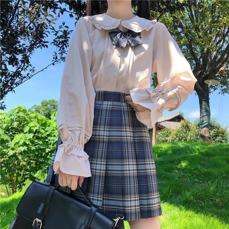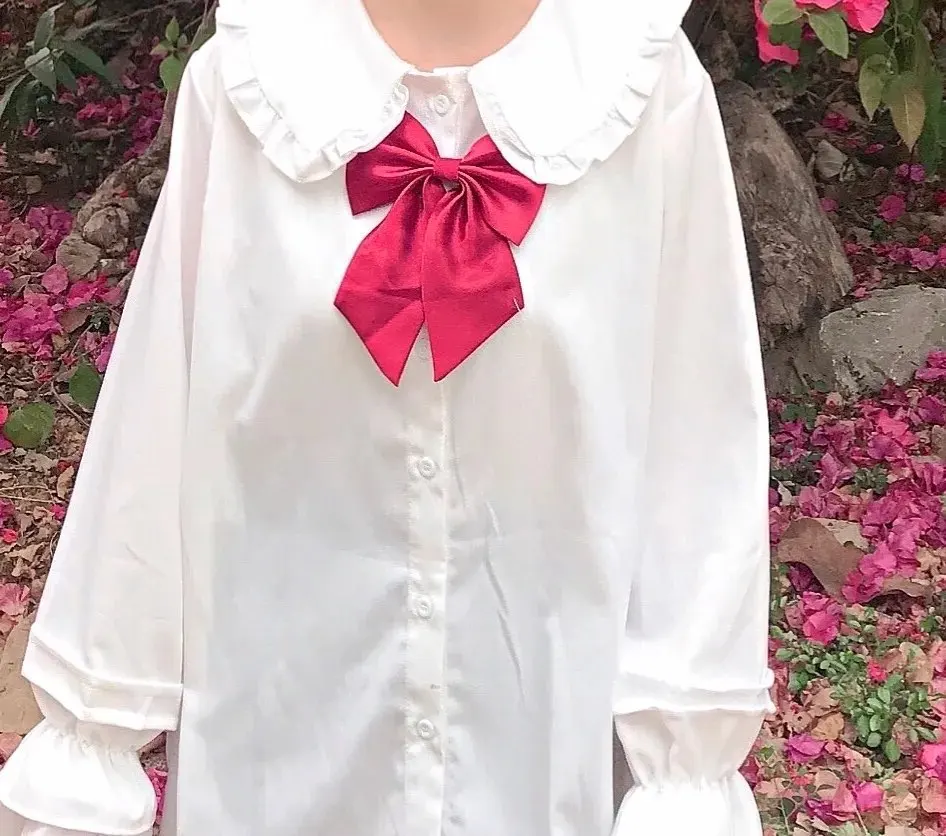 QWEEK, белая рубашка с длинным рукавом для девочек-подростков, Женская Весенняя блузка в японском стиле преппи с милыми оборками и воротником Питер Пэн в стиле Лолита, топы