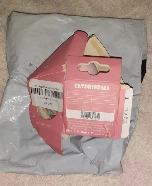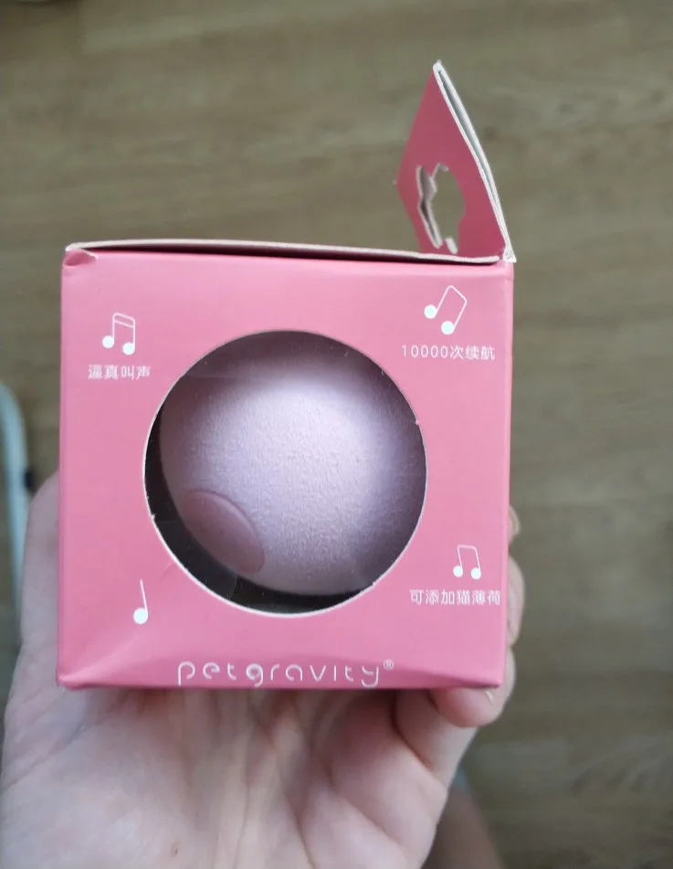 коробка развалилась, от слова, вообще, шарик непонятно из какого материала сделан, очень похоже из очень спресованного пенопласта, кошке нравится, поёт ненавязчиво, (батарейка уже стояла) в общем неплохо, думаю кошка быстро с ним разберётся, просто разгрызёт, непонятный порошок зелёного цвета, без запаха, не знаю что это, кошка на него никак не реагирует.