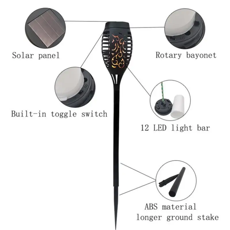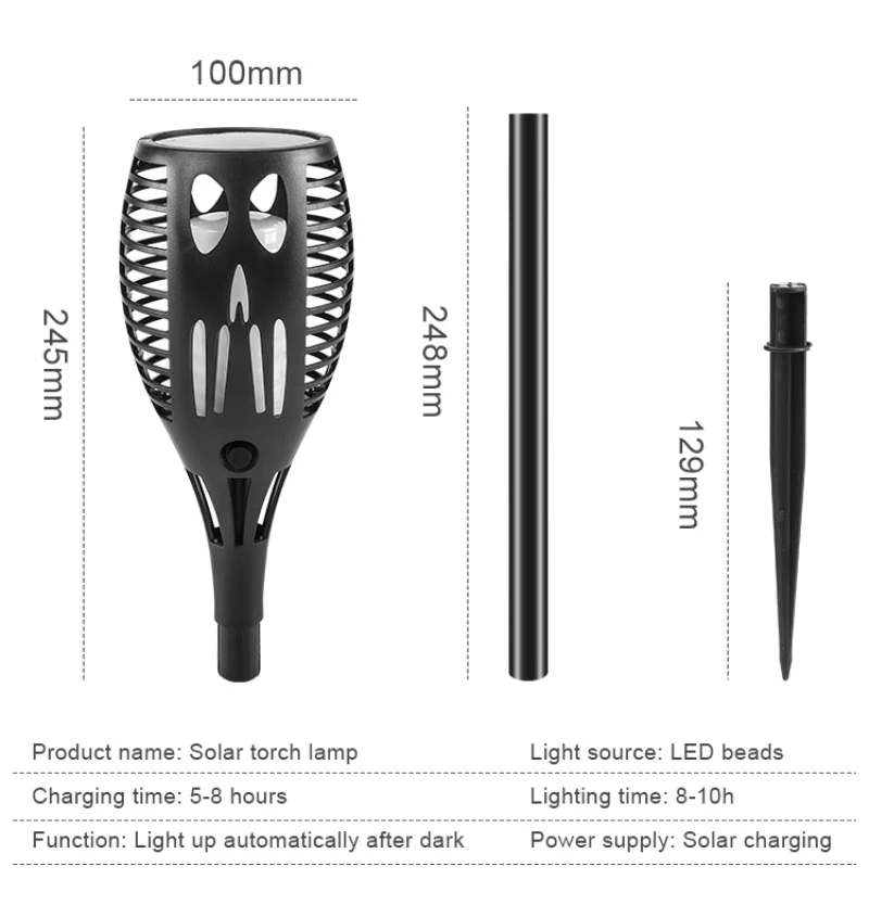 -Питание от солнечной энергии: это наружное пламя солнечных факелов собирает солнечную энергию в течение всего дня под прямыми солнечными лучами, затем включается автоматически в сумерках. Светильник работает на солнечной энергии, поэтому вы можете разместить его в любом месте под прямым солнечным светильник!
