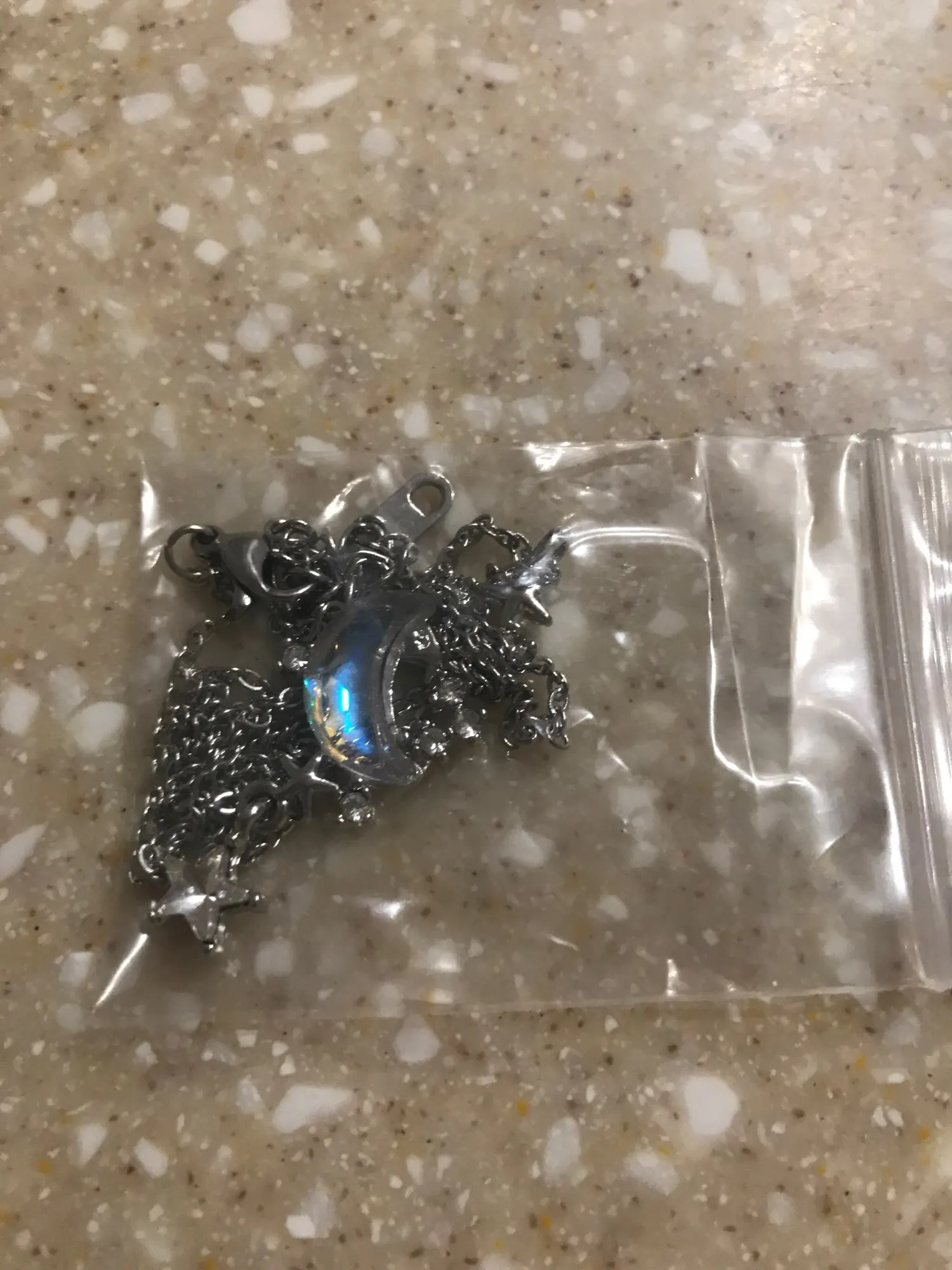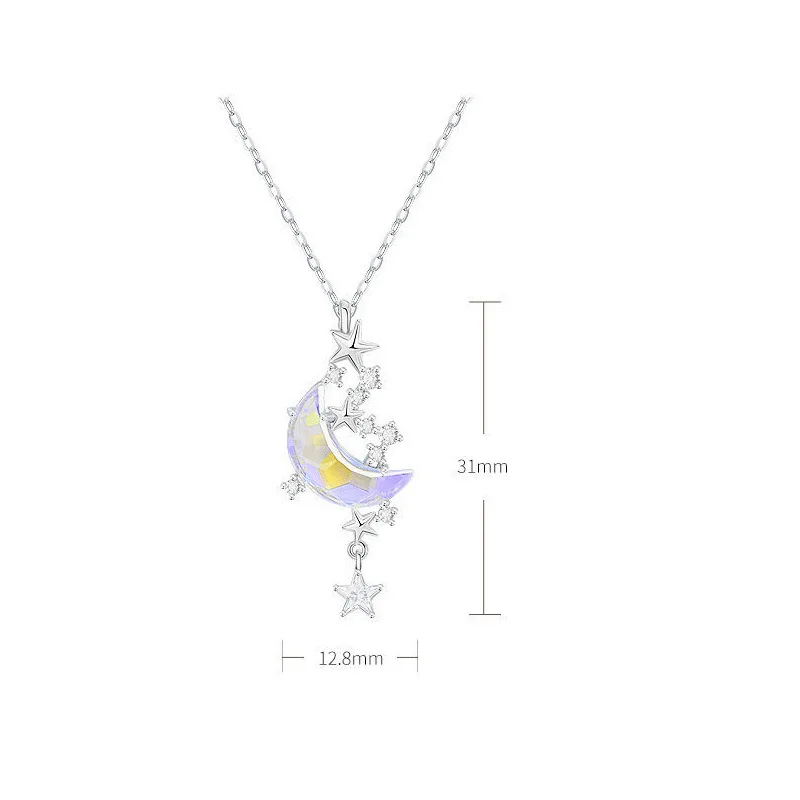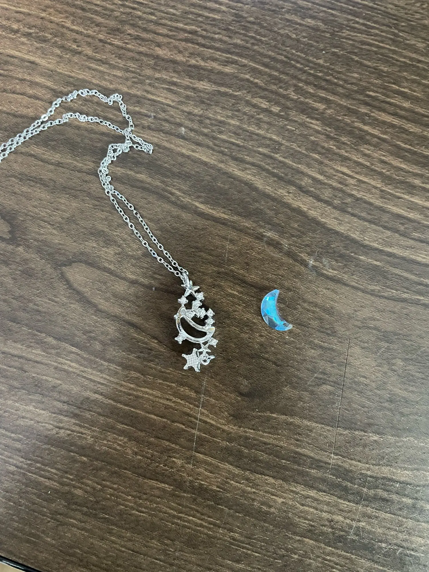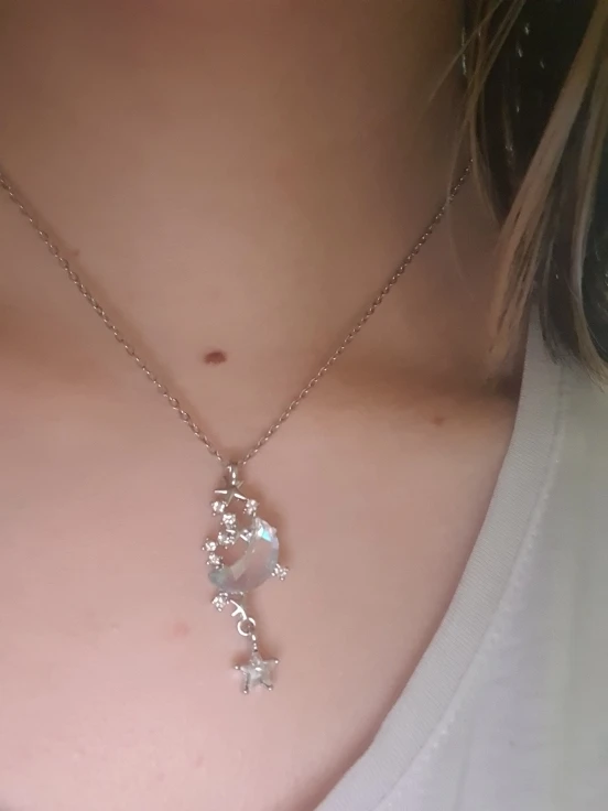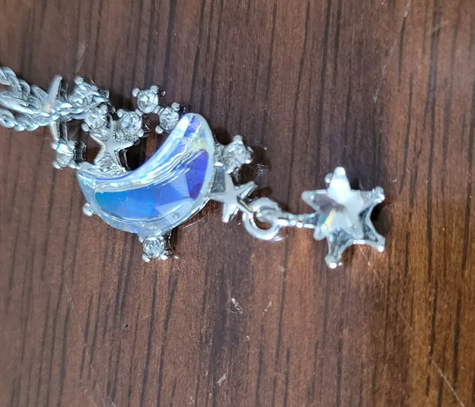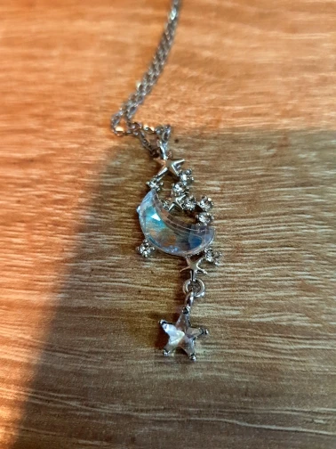 l'image n'est pas fidèle au produit. la lune semble être un crystal transparent uniquement hors elle repose sur un cadre de métal...et étant donné la petite taille du pendentif. l'effet de la transparence n'est pas comme sur la photo. Déçue.