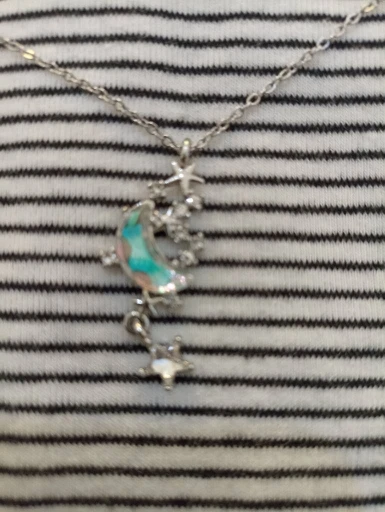 Кулон выполнен качественно, всё камушки на месте, застёжка надёжная. Сам полумесяц очень красиво переливается на свету.