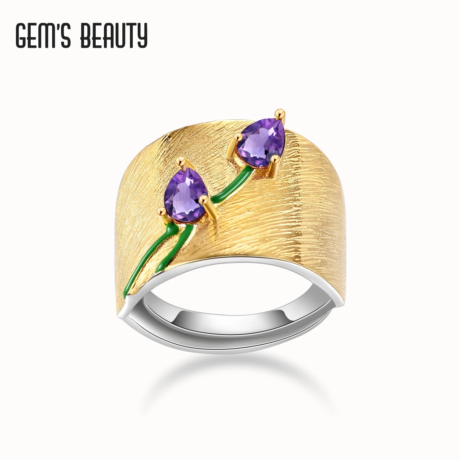 Оригинальное эффектное кольцо из серебра 925 пробы ручной работы, ювелирные изделия, подарок, натуральный драгоценный камень, аметист, золотая пластина, тюльпан