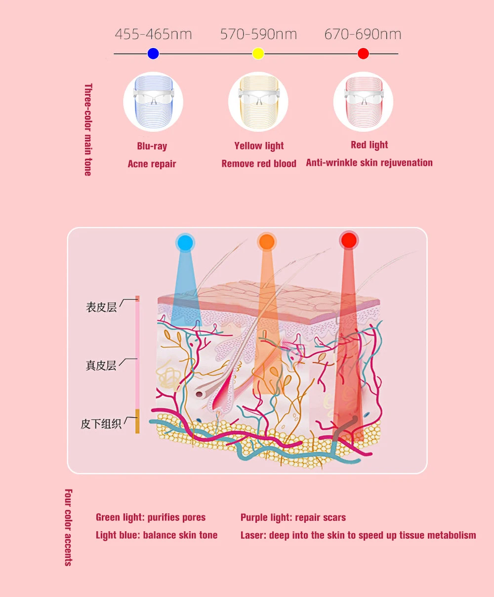 1. Длина волны красного света варьируется от 620 до 750 нм, и это повреждает кровообращение, стимулирует метаболизм, генерирует клаген, помогает уходу за морщинками и улучшения кожи. 2. Длина волны лазера синего света варьируется в зависимости от формы 476 для 495nm и удаляет propionibacterium угрей, полезно для акне уход, улучшая envronment в волосах flile 3. Длина волны лазера оранжевого света варьируется в зависимости от 590 к 620nm, и он улучшает удобный емкостный Мини-стилус, служащий также в кислородный обмен в клетке, Acelerae цикуляции крови вместе с выцветанием пигментов, поэтому, я помогает улучшить, чтобы смягчить кожу. 4. Зеленый свет (520 нм) для нейтрализации, баланс состояния кожи снимает умственный стресс и efective dredge lymphoid и edema. 5. Фиолетовый свет: это красный и синий двухполосный свет, сочетание двух видов фототерапевтического эффекта, особенно в исцелении и ремонте шрамов от акне. 6. Светло-фиолетовый свет: разрешение пигментных пятен, улучшение тонких линий и обвисания кожи. 7. Цианин свет: усиливает клеточную энергию, стимулирует метаболизм.