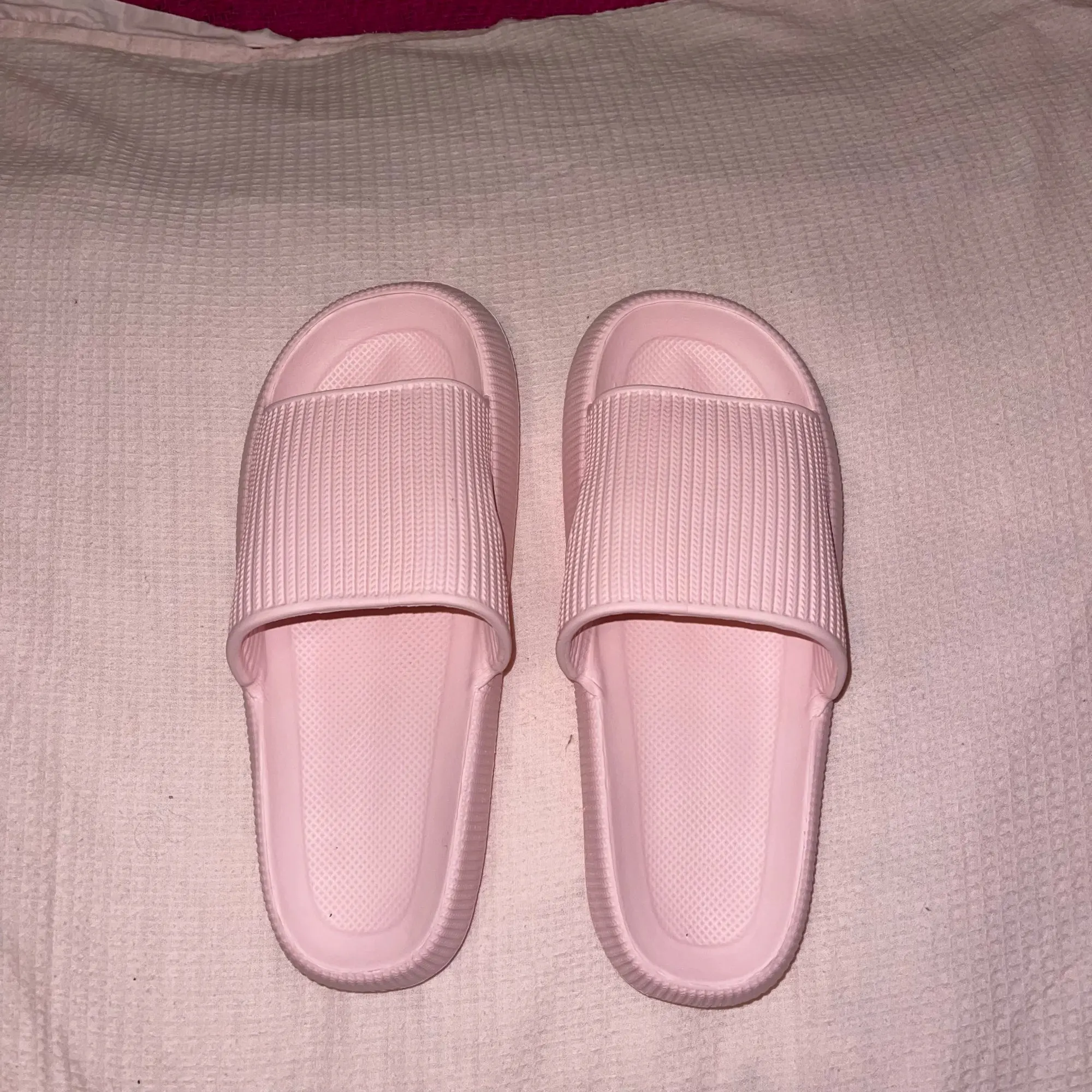 Тапки, как маршмеллоу. Объемные, клевые, всегда такие хотела себе для бассейна. Размер соответствует, качество хорошее. Подойдут и на широкую стопу. Я ношу 38 размер, выбрала размер 38-39, тапки подошли отлично. Рекомендую !!!