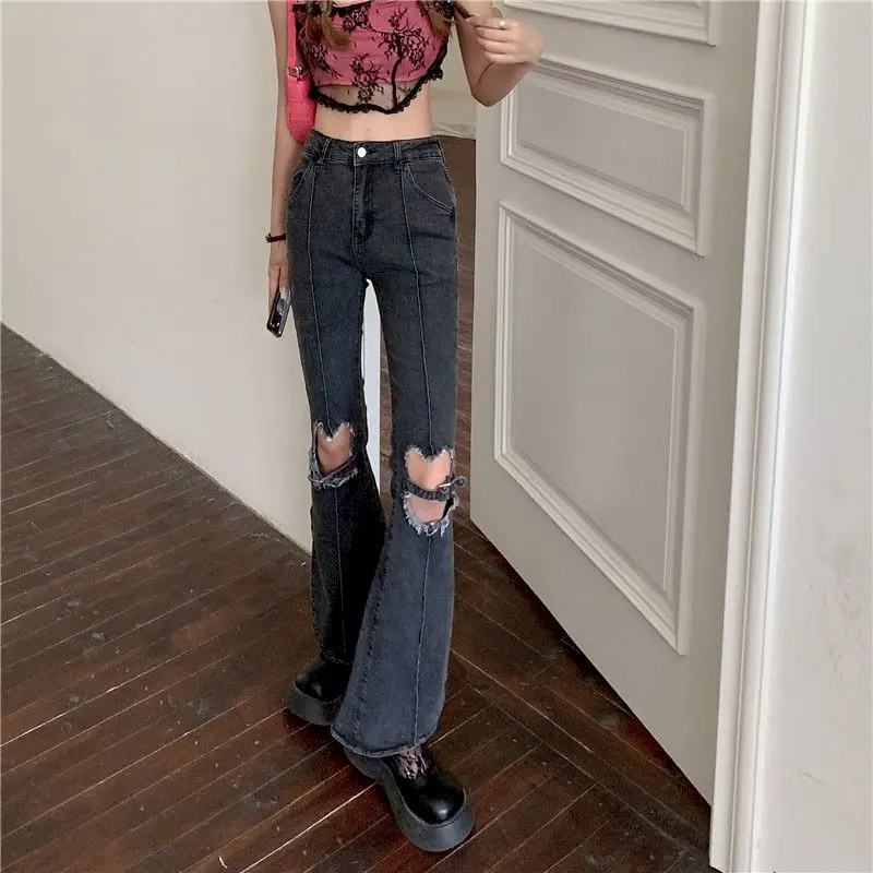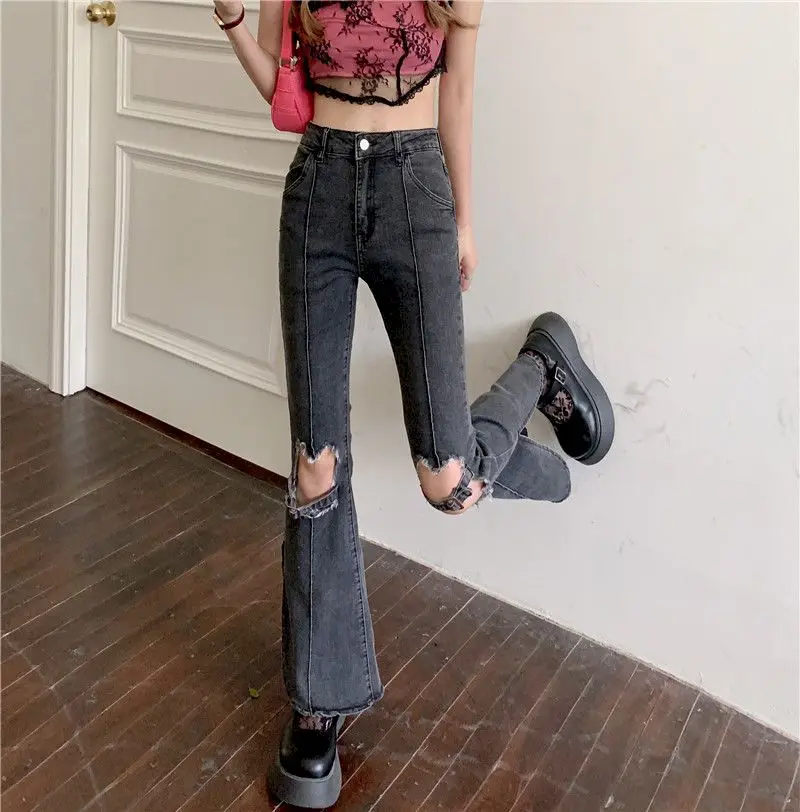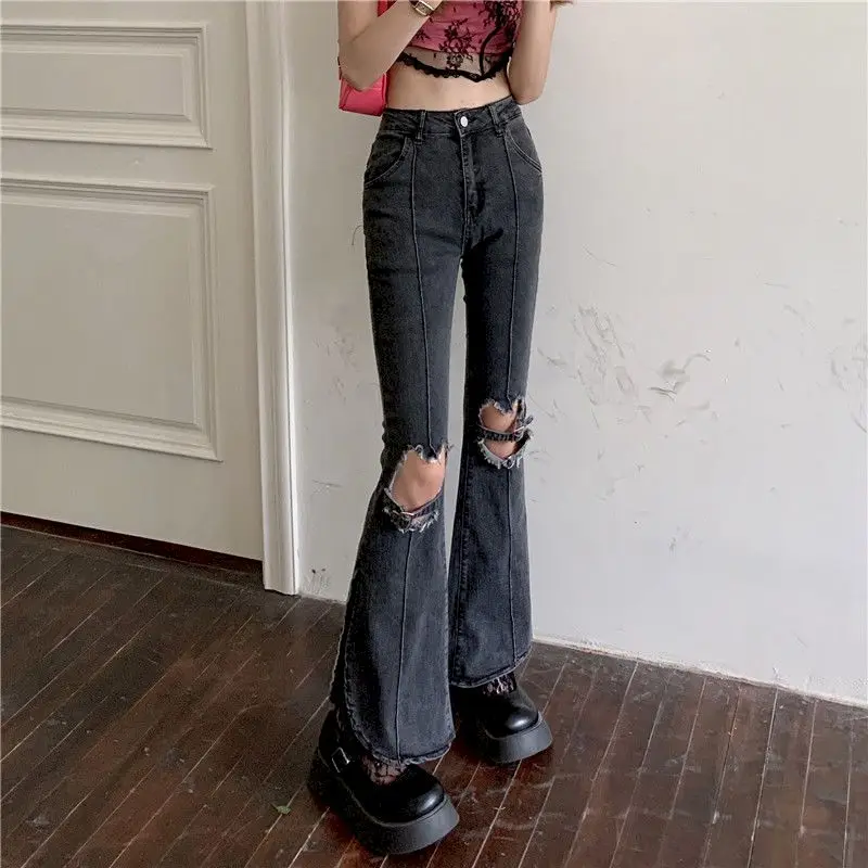 Женские рваные джинсы-клеш Y2k, уличные широкие голубые потертые джинсовые брюки с завышенной талией