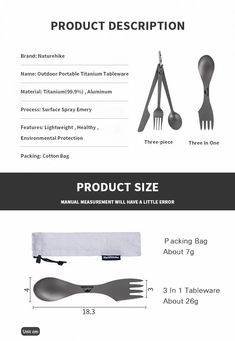 Портативные титановые столовые приборы Naturehike, 3 в 1, нож, вилк...