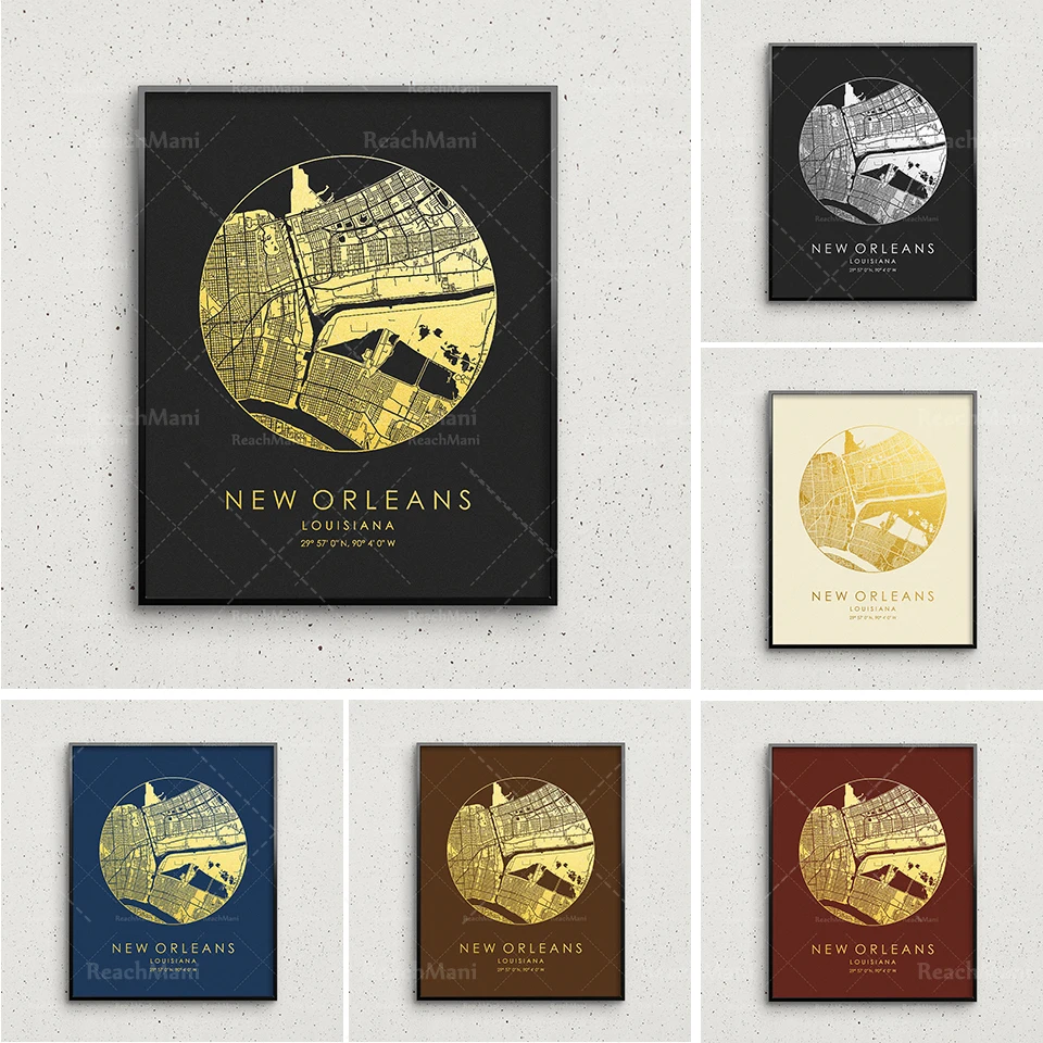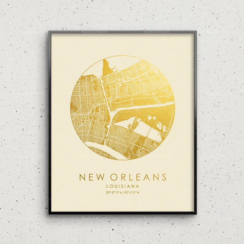 Карта Нового Орлеана, Золотая и серебряная печатная карта города, круглая, декоративный настенный плакат подарок, США