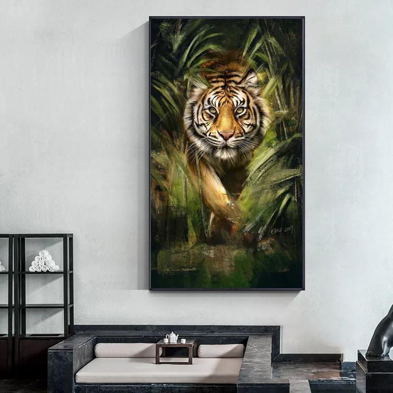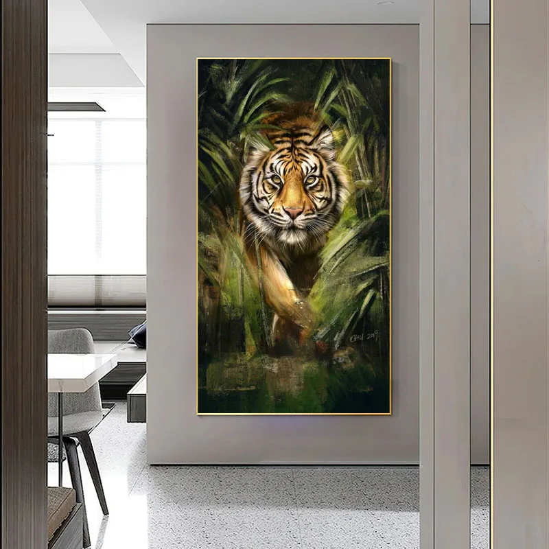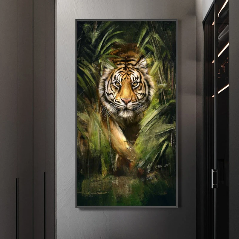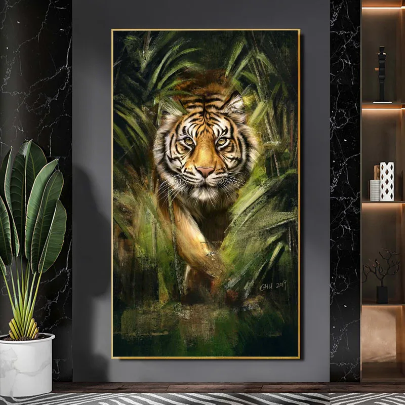 Картина абстрактная на холсте, с изображением травы, дикое животное, тигр