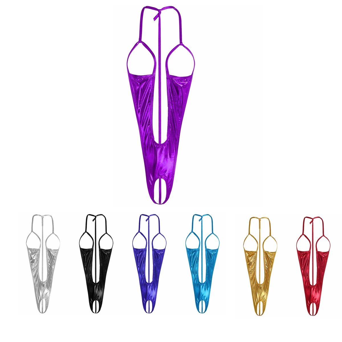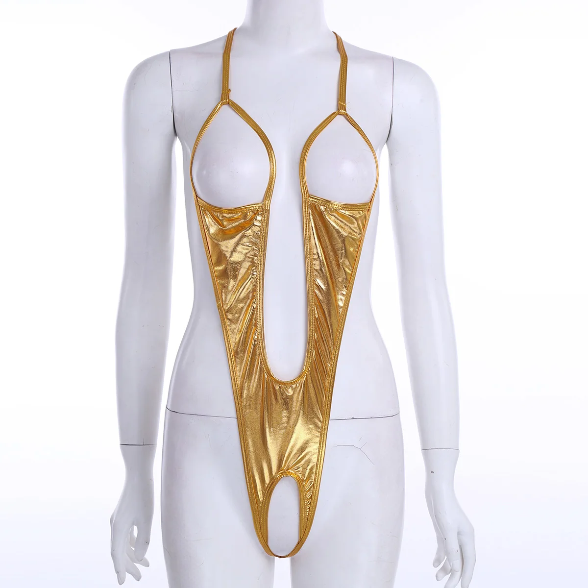 Женский Облегающий комбинезон с лямкой на шее и вырезом, блестящий комбинезон с металлическим блеском, боди с открытой чашкой, сексуальные боди, нижнее белье с вырезами, костюм