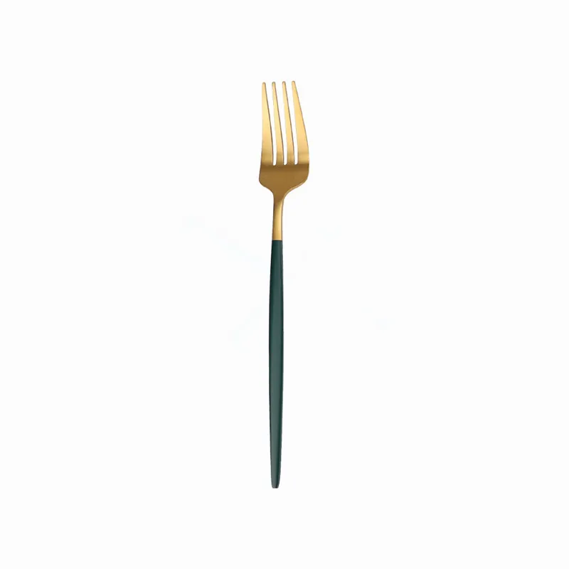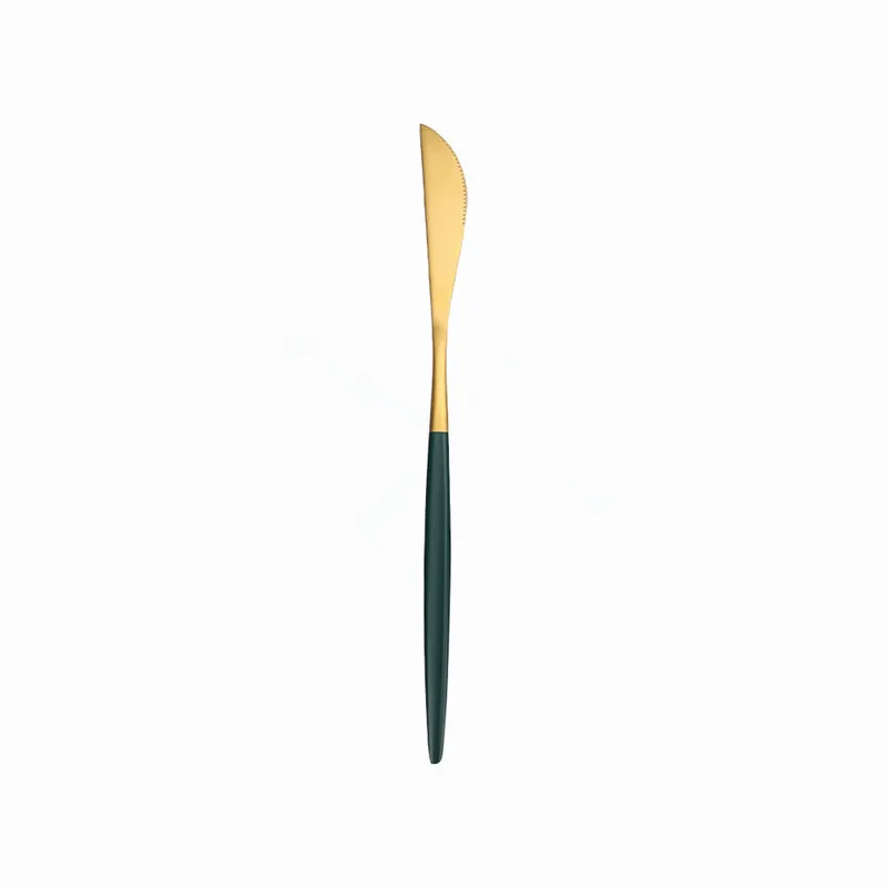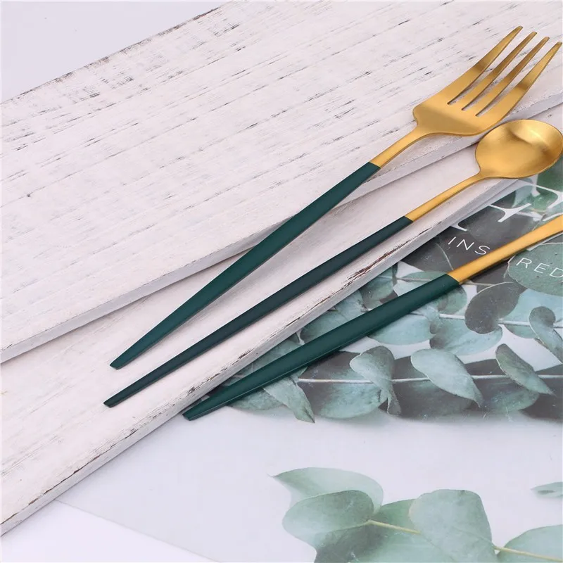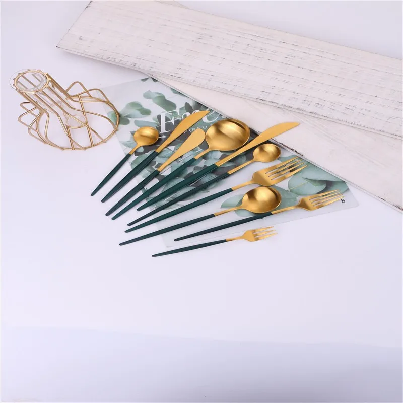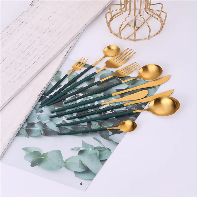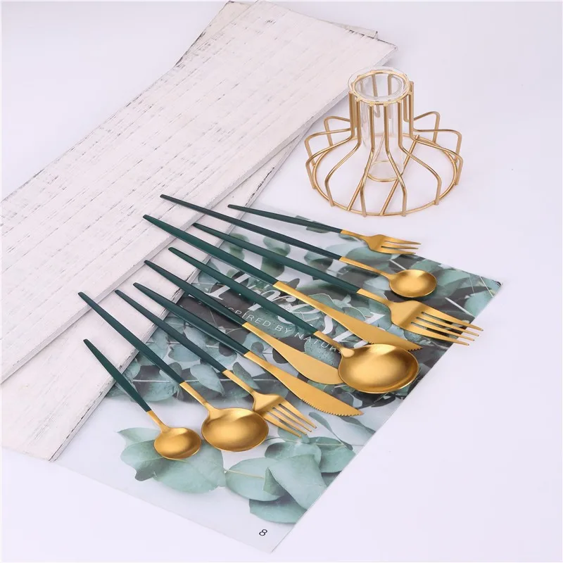 Набор столовых приборов из нержавеющей стали, комплект из матовой столовой посуды зеленого и золотого цвета, десертные ложки, стальные столовые приборы, кухонная посуда