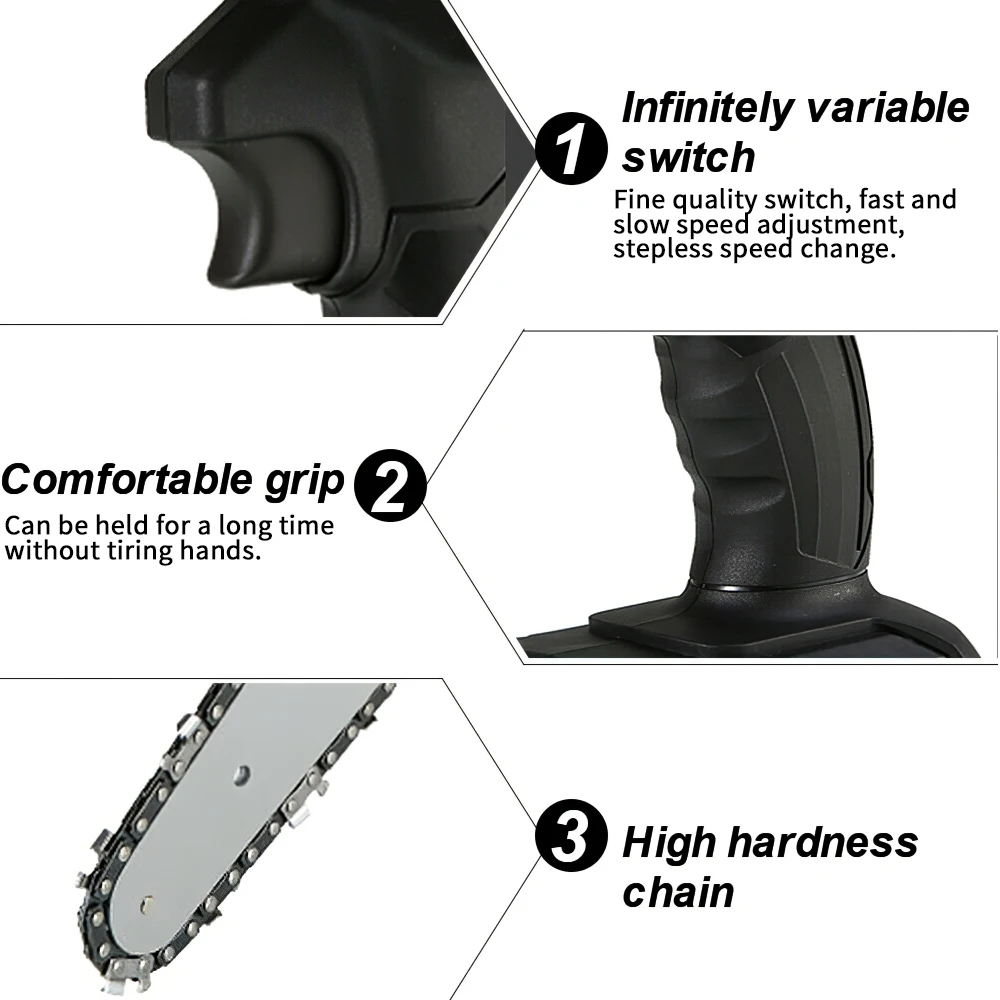 -Маленький размер, можно держать одной рукой.-Практичная, быстрая скорость, низкое энергопотребление.-Переключатель отличного качества, быстрая и медленная регулировка, плавное изменение скорости.-Щеточный двигатель из чистой меди, высокая мощность, быстрая резка, повышение эффективности.-Высококачественная направляющая цепь, глубокая закалка, более износостойкая, гладкая резка.-Перезаряжаемая Электрическая цепная пила, светильник и портативный, длительный срок службы батареи, без повреждений коры.-Светильник вес тела, светильник и удобный, светильник вес конструкции, долгое время хранения и не устают руки.-Интеллектуальная плата управления цепью, защита от перегрузки, для удовлетворения ваших различных потребностей в конструкции.-Специальная направляющая пластина, шарик из вольфрамовой стали не нужно смазывать, так что машина уменьшает сопротивление во время работы и уменьшает износ на машине.
