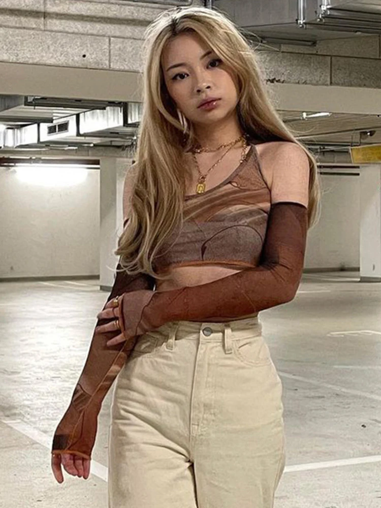 Топ с лямкой на шее, Женский коричневый корсет, топ, укороченный топ с принтом, футболка с длинным рукавом, весна-лето, уличная одежда, облегающий топ с открытой спиной, Y2K одежда